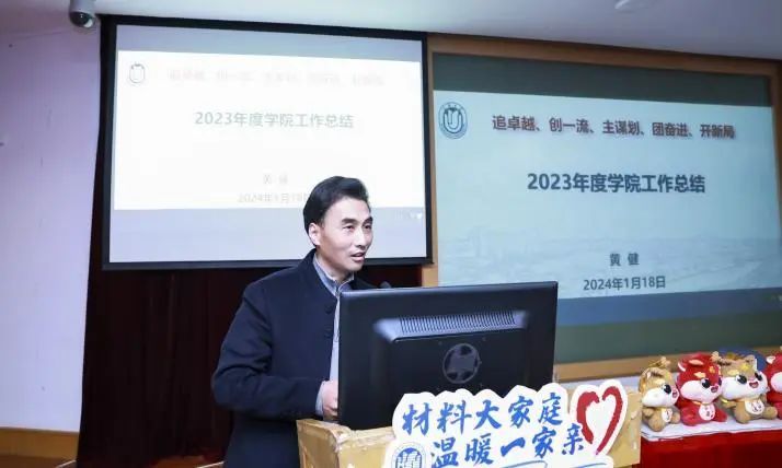 党委书记黄健对本年度学院各项工作进行了汇报总结。对于2023年度关键业绩指标完成情况,他从人才培养、科研经费、科研项目、科研获奖、高水平论文发表、国家级平台基地建设、一流学科建设、人才引培、研究生和国际生、就业、招生和社会捐赠等方面展开。黄健书记在介绍2023年度工作亮点及重要进展时表示,学院在党建、主题教育、产学研合作、国际交流、团队建设、实验安全管理等方面均有突出成效,并分享了典型案例。最后,黄健书记对设备资产管理、科研管理等提出建议。