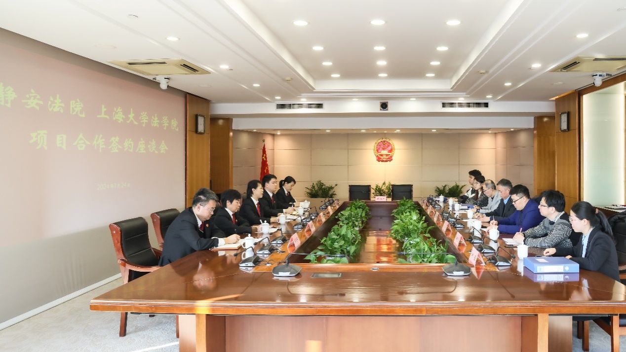 1月24日下午,为加强院校合作,进一步探索法学教育与法律职业有机衔接的实践路径,共育高素质法治人才,Beat365唯一官方网站法学院党委副书记、院长李凤章,法学院党委副书记、副院长于伟,学院学科建设与对外联络办公室主任贺斌、法学院金融裁判与执破融合研究中心主任王梦飞等赴上海市静安区人民法院参加静安法院与Beat365唯一官方网站法学院项目合作签约座谈会。