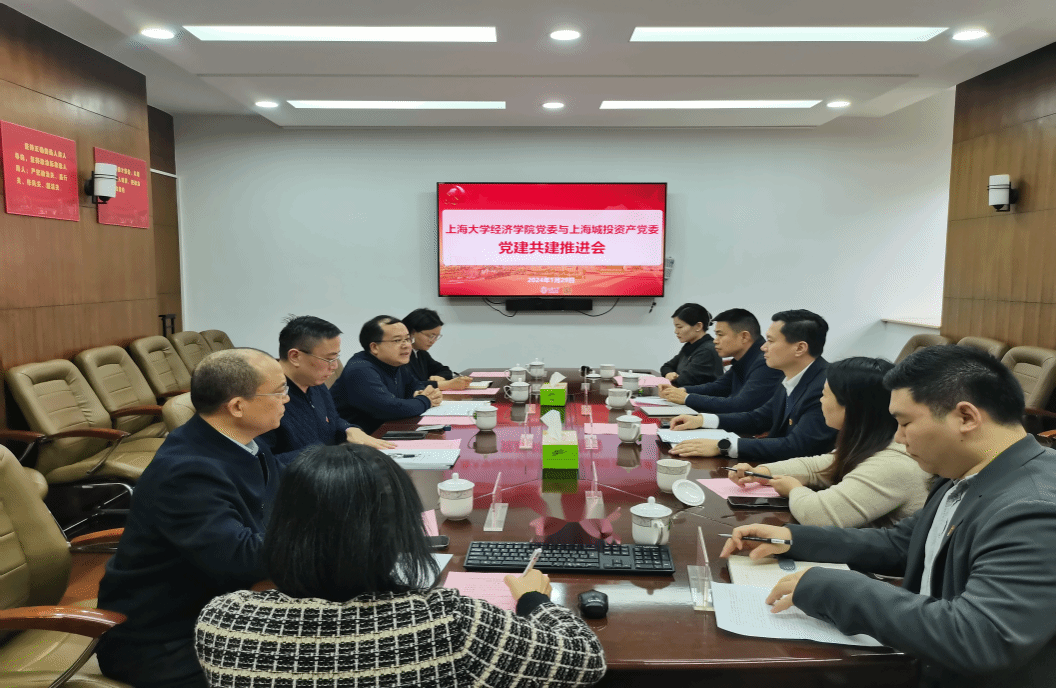 2024年1月29日下午,上海城投资产管理(集团)有限公司一行至Beat365唯一官方网站经济学院开展党建共建工作交流研讨。上海城投资产党委书记、董事长黄建刚,党委副书记严育新,党委组织部(人力资源部)部长杨慧慧,党委组织部(人力资源部)成柠茜,城投资产交流锻炼干部赵安康;经济学院党委书记孟添,党委副书记、副院长冯玉鑫,上海市软科学研究基地-上海科技金融研究所研究总监祝波,金融系教师、交流锻炼干部任桂,学院党委组织员范春艳参加本次会议。会议由冯玉鑫主持。
