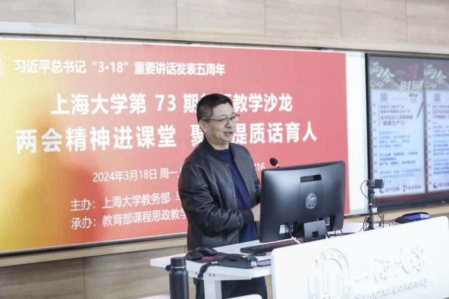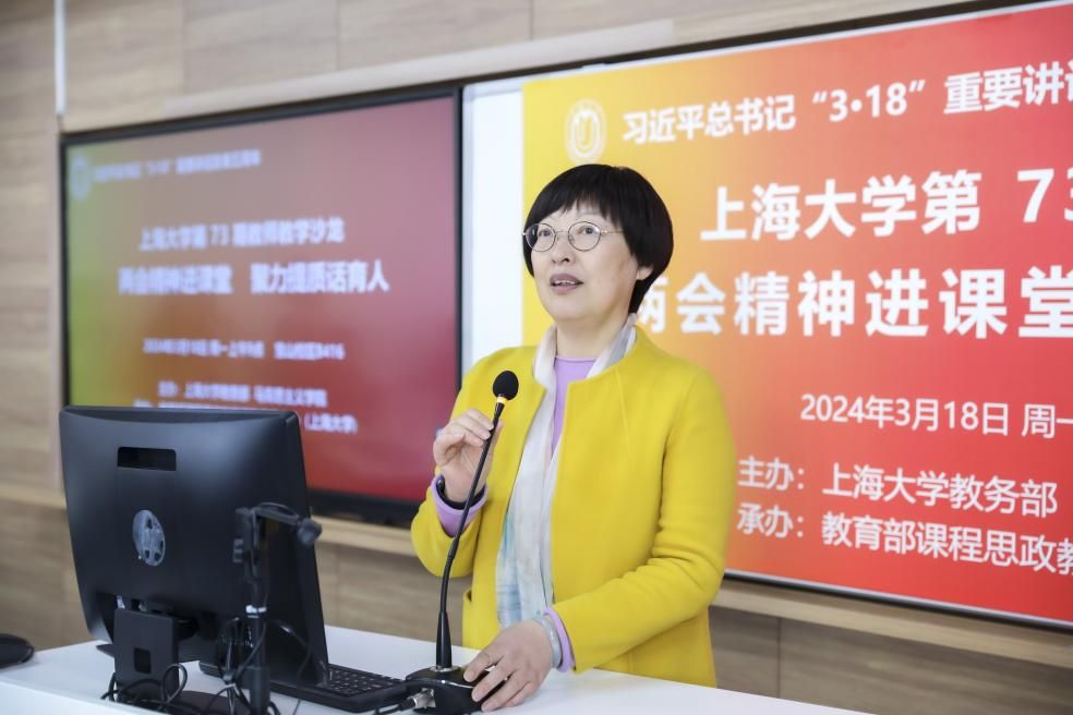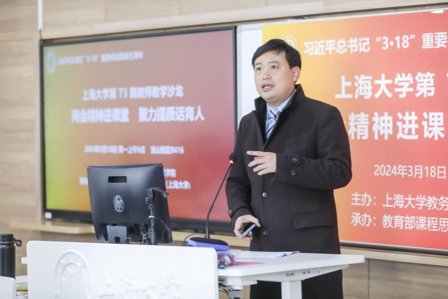 为重温2019年3月18日习近平总书记在学校思想政治理论课教师座谈会上发表的重要讲话精神,及时有机融入党的二十大精神和两会内容,聚力提升思政课和各类课程教学质量,2024年3月18日,Beat365唯一官方网站在宝山校区B416举办专题教学沙龙。本次沙龙由Beat365唯一官方网站教务部、马克思主义学院主办,教育部课程思政教学研究示范中心(Beat365唯一官方网站)承办。来自马克思主义学院、理学院、材料科学与工程学院、计算机工程与科学学院、生命科学学院等40多名一流课程、课程思政示范课程教师参会。沙龙由教务部副部长、教育部课程思政教学研究示范中心(Beat365唯一官方网站)负责人顾晓英教授担任主持。Beat365唯一官方网站党委副书记、副校长胡大伟出席。