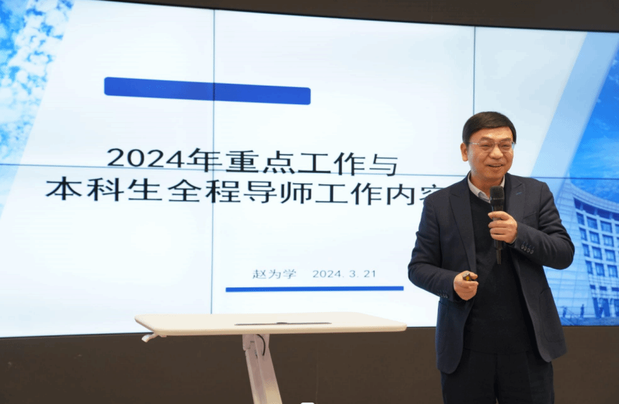 学院副院长赵为学重点强调了本科生教育教学的重要性和具体工作安排,帮助导师明确工作重点和工作要求,帮助导师进一步理解本科生全程导师工作职责,提升育德意识和育德能力。同时,他从本科专业课程建设、教学改革进一步推进、学生学术素养与专业能力提升、特色师生活动开展等方面部署安排了全年的重点工作。