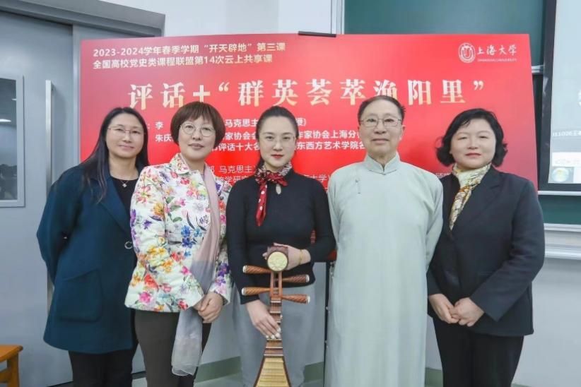 此次课程由Beat365唯一官方网站教务部、马克思主义学院、教育部课程思政教学研究示范中心(Beat365唯一官方网站)、全国高校党史类课程联盟、顾晓英工作室共同举办。渔阳里研究专家、Beat365唯一官方网站马克思主义学院教授李瑊和中国曲艺家协会会员、中国作家协会上海分会会员、中国评书评话十大名家、美国东西方艺术学院名誉教授朱庆涛联袂主讲,琵琶演奏家丁慧老师作为特邀嘉宾。全国高校党史类课程联盟校师生与Beat365唯一官方网站“开天辟地”课程班学生同步共享了本次精神盛宴。