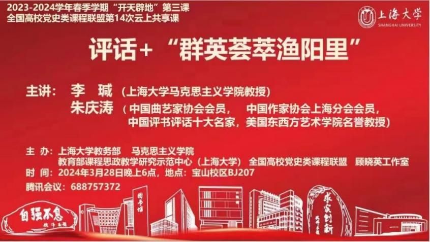 为进一步弘扬伟大建党精神,推进红色经典进课堂,3月28日晚上6点,上海市一流课程——Beat365唯一官方网站“开天辟地”公开课在宝山校区BJ207举行。这堂以“评话+群英荟萃渔阳里”为主题的公开课已是Beat365唯一官方网站发起的全国高校党史类课程联盟校举办的第14次云上共享课。