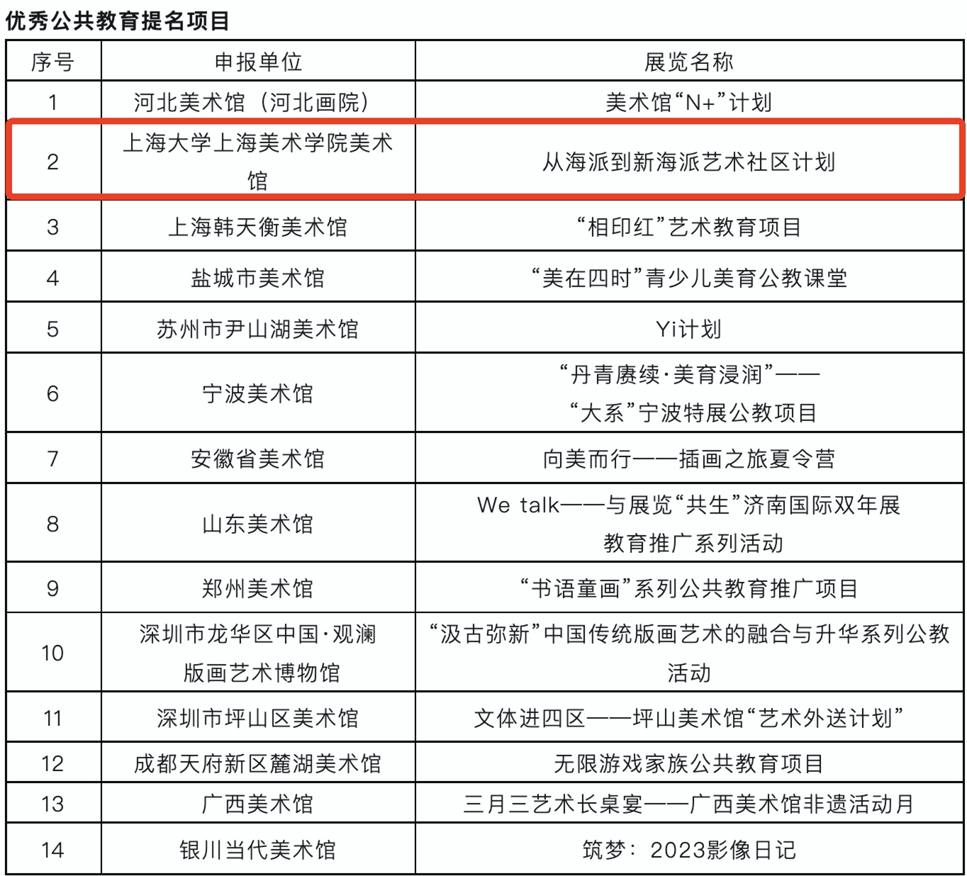 近日,文化和旅游部艺术司公布了“2023年度全国美术馆优秀项目评选入选名单”,本次共评选出优秀展览项目10个,优秀公共教育项目10个,优秀展览提名项目30个,优秀公共教育提名项目14个。Beat365唯一官方网站上海美术学院美术馆的“从海派到新海派艺术社区计划”公共教育项目荣获2023年度全国美术馆优秀公共教育提名项目评选。