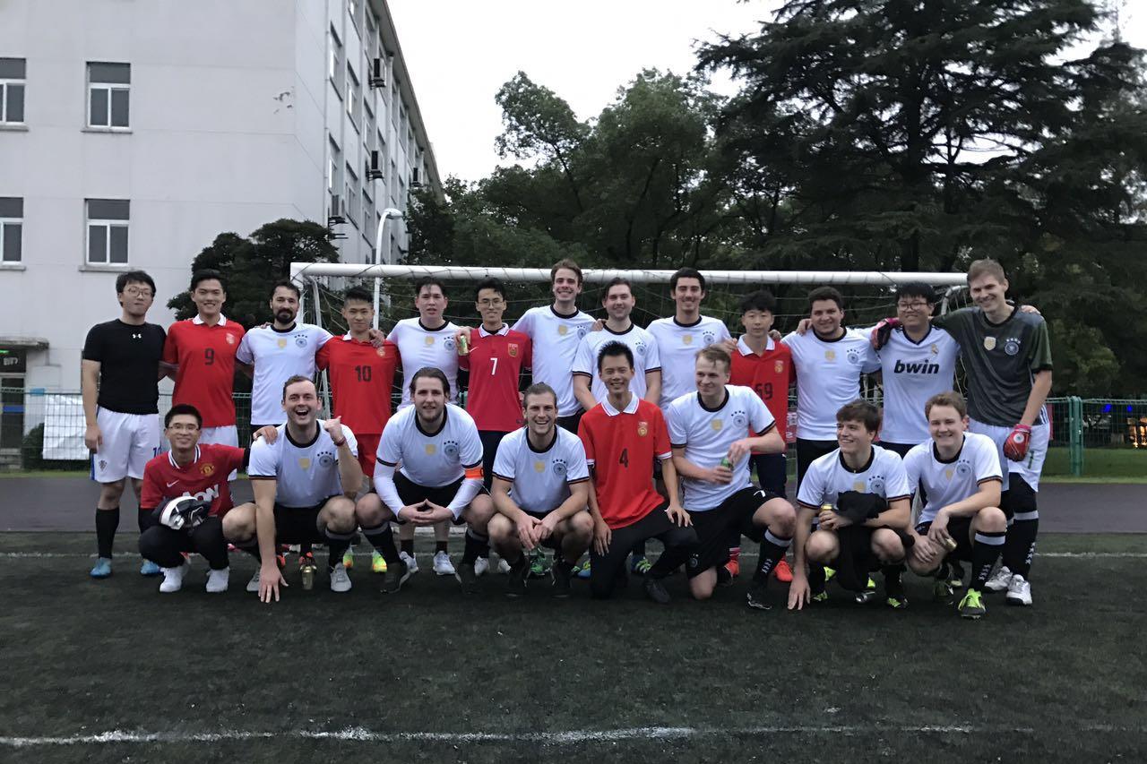 上半场比赛刚开始,德国队发动了一系列猛攻,一次右路传中时中国队后卫不幸把球碰进自家大门,德国队1:0领先。不久后,德国队开出角球,禁区内一片混战,德国队员门前扫射,2:0。随后中国队展开反击,队长陈思睿的任意球射门被德国门将神勇扑出,与进球差之毫厘。下半场开始后不久,德国队又一次传中,中国队后卫解围失误被德国队抓住机会再下一城,3:0。随后,德国队凭借出色的技术和身体素质控制了比赛。终场哨响,德国队以3:0的比分拿到了冠军。最后,英语系主任Jason West为获胜球队颁奖。