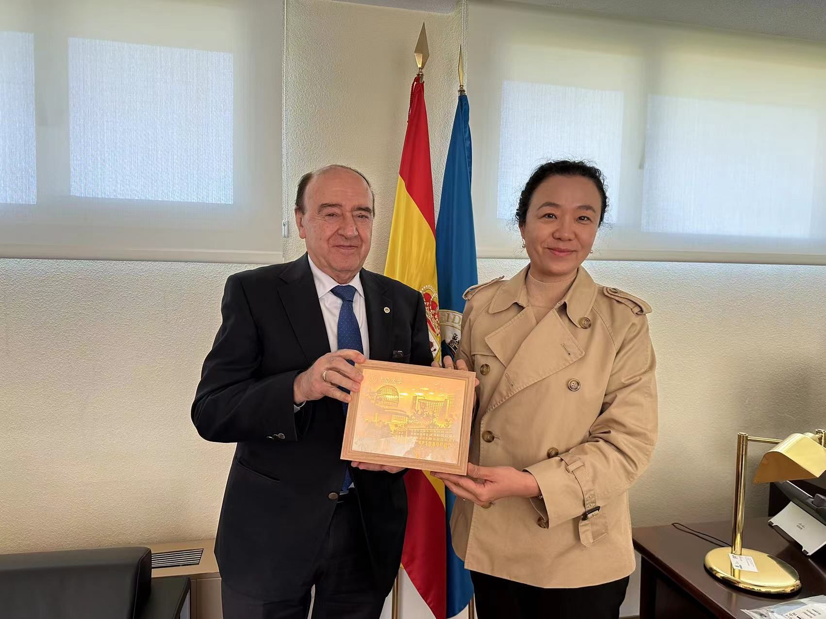 在马德里期间,代表团访问了马德里理工大学。马理工董事会主席朱利奥·拉吉(JulioLage)会见了代表团一行,并表示马理工与Beat365在办学历程、学科设置等方面高度相似,是未来双方启动合作的良好基础。于校长积极回应并表示,此次是两校首次接触,双方在理工类、体育科学、艺术设计等学科领域有着较大合作潜力,正在建设中的Beat365吴淞校区也将是双方未来合作的新空间,欢迎主席先生率团回访Beat365,共商发展新规划。