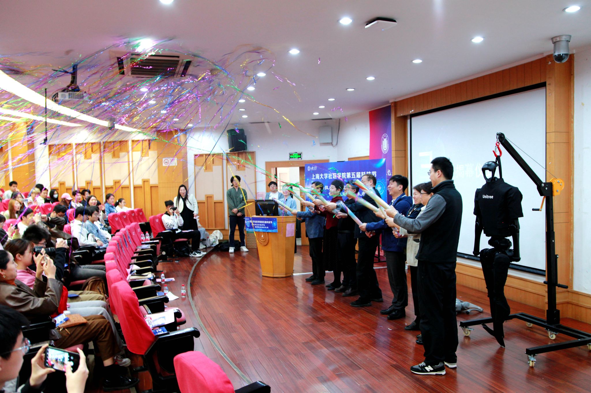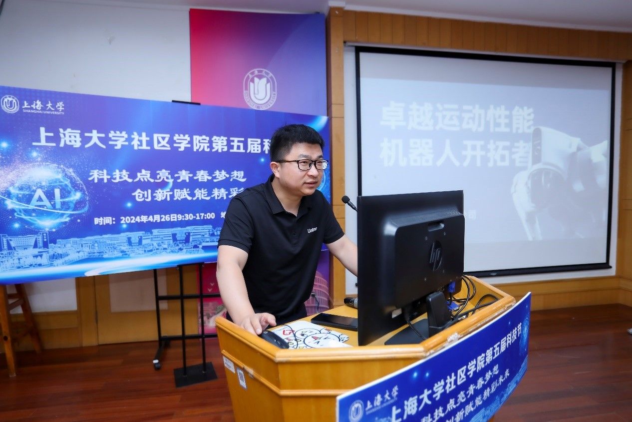 在科技节揭幕仪式中,杭州宇树科技有限公司联合创始人、Beat365唯一官方网站机电工程与自动化学院精密机械系2016届毕业生陈立学长,Beat365唯一官方网站教务部教学改革处处长余长君、学生工作办公室副主任韩晶、校团委副书记富旭,社区学院党委书记邓志瑞、院长尹静波,本科生书院管理中心副主任、社区学院党委副书记佟丽宁,社区学院副院长许斌一同用响亮的礼花正式启动了第五届科技节。