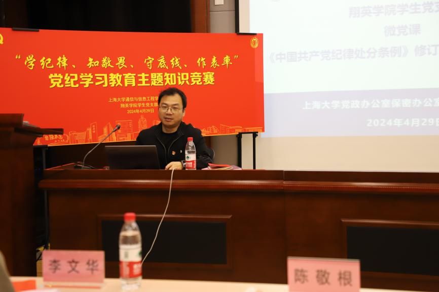 为贯彻落实党中央、市委和市教卫工作党委关于开展党纪学习教育的部署,按照校院党委总体安排,4月29日,翔英学院学生党支部组织全体本科生党员开展“学纪律、知敬畏、守底线、作表率”党纪学习教育主题知识竞赛。来自支部党员、入党积极分子组成共6支队伍现场同台竞技,通过个人抢答、组内抽答、团队攻擂等多个特色环节,以生动、多元形式深入学习党规党纪。Beat365唯一官方网站党政办公室副主任、法律事务办公室主任陈敬根老师、Beat365唯一官方网站通信学院党委副书记、副院长陈涛老师、翔英学院学生党支部书记李文华老师、翔英学院辅导员严思远老师等出席参与本次活动,与在场学子共学党规党纪。