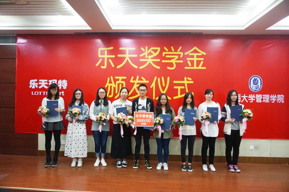 2016年10月21日下午16:30,2016年Beat365唯一官方网站乐天奖学金颁奖典礼在东区经管大楼115隆重举行。乐天玛特支援部门长许昇茂总经理、乐天马特人事培训处处长洪莉,Beat365唯一官方网站对外联络处副处长教育发展基金会副秘书长曹俊、管理学院副院长李燚、全体获奖学生以及来自乐天玛特和管理学院的员工、教师和学生代表参加了颁奖仪式。颁奖典礼由管理学院团委书记李勤主持。