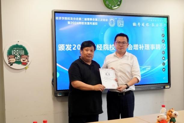 之后,在座校友与学院领导班子、教师代表开展深入的分享交流,进一步促进了学院与校友同发展、共进步。随后,经济学院校友分会会长聂永有为田旻校友颁发2024年经济学院校友分会理事聘书,也预示着经济学院与校友们将深入携手共进,共创美好未来。