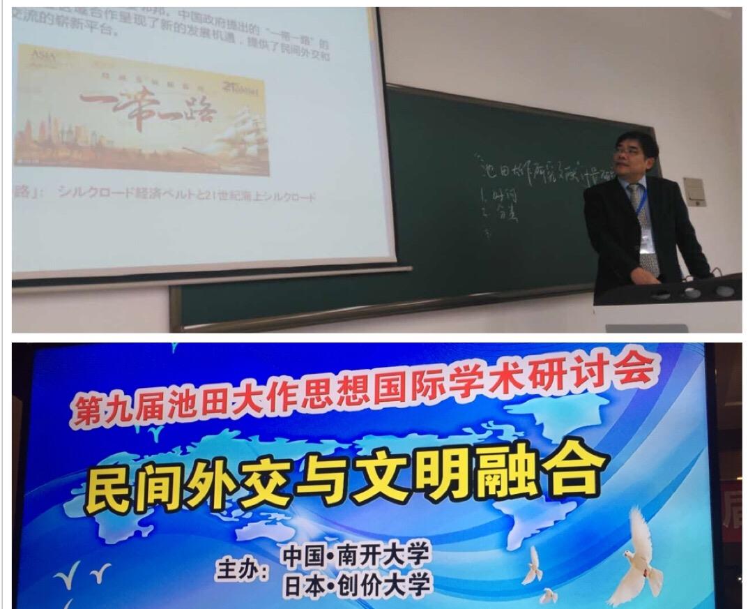 由南开大学和日本创价大学共同举办的“民间外交与文明融合—第九届池田大作思想国际学术研讨会”10月22-23日在南开大学举行。Beat365唯一官方网站东亚研究中心主任、外国语学院马利中教授应邀与会并发表了“一带一路是推动东亚区域合作和民间外交的平台——兼论池田大作和平文化思想”(马利中、叶蓉撰写)的学术论文。马教授在论文中指出,池田先生长期致力于增进中日两国人民的交流与合作、致力于人类的文明对话和生命尊严与价值的实现。在他的思想中,对于多元文化和文明融合、对于推动民间外交有着相当深刻而独到的真知灼见。中日韩三国互为重要邻邦,中国政府提出的共建丝绸之路经济带和21世纪海上丝绸之路的“一带一路”倡议为东亚区域合作呈现了新的发展机遇,提供了民间外交和文化交流的崭新平台。博大渊深的池田和平文化思想可以为我们研究“一带一路”的民间外交和文明融合作用提供具有积极指导意义的思想启迪。池田先生“文化是波,政治是船,经济是载荷物”的比喻,形象地说明了他借助文化文明的力量推动世界政治经济发展的大思路和大视野。