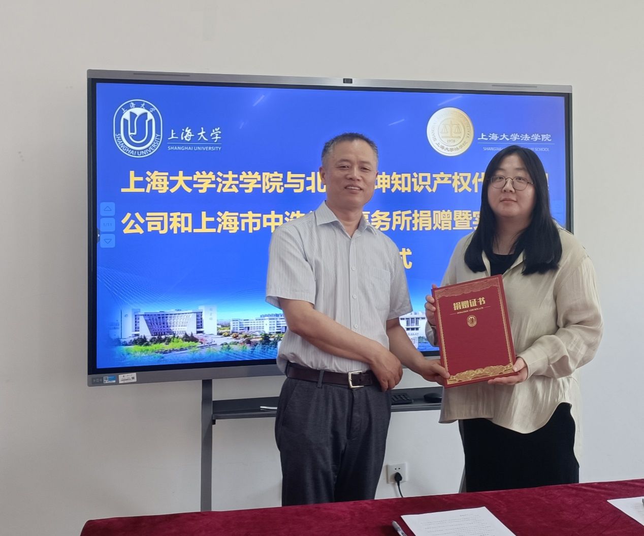 在捐赠仪式中,李凤章院长代表法学院向北京启坤知识产权代理有限公司、上海市中浩律师事务所颁发捐赠证书,感谢其对Beat365唯一官方网站学科建设、人才培养和学生实践等方面的大力支持,希望双方加强联系,共同组织丰富多彩的校企交流活动。