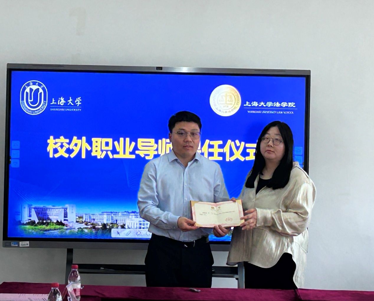 在法学院校外职业导师聘任仪式上,于伟副书记代表法学院向龚清华、王飞两位校外职业导师颁发聘书。于伟老师首先对二位的到来表示热烈欢迎,介绍了学校及学院的办学历程,在人才培养、学科建设等方面取得的成就以及未来发展的目标,并希望未来加强与律所、企业的双向合作、促进共同发展。