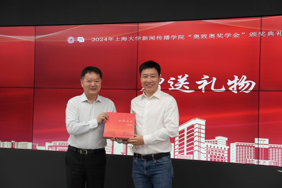 接着,严院长代表Beat365唯一官方网站新闻传播学院为上海奥致奥科技集团股份有限公司赠送了《百年Beat365画传》,寄寓了Beat365唯一官方网站新闻传播学院对上海奥致奥科技集团股份有限公司在行业继续昂扬发展,不断攀登发展高峰的衷心祝愿。
