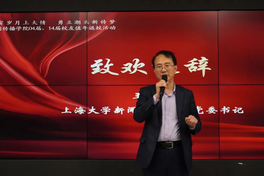 学院党委副书记、院长严三九向各位校友介绍了学院近年来的发展情况。学院在“双共建”平台上,发挥平台优势,集聚多方资源,推进学院高水平学科建设。近年来,学院积极引进师资人才,培育一流课程,建设基础设施,形成了较为完备的人才培养体系。学院也将明确人才培养目标,努力建设立足上海、服务国家、放眼全球、特色显著、引领前沿的世界一流新闻传播学院。严三九院长也对各位校友一直以来的关心、支持和帮助表示感谢。