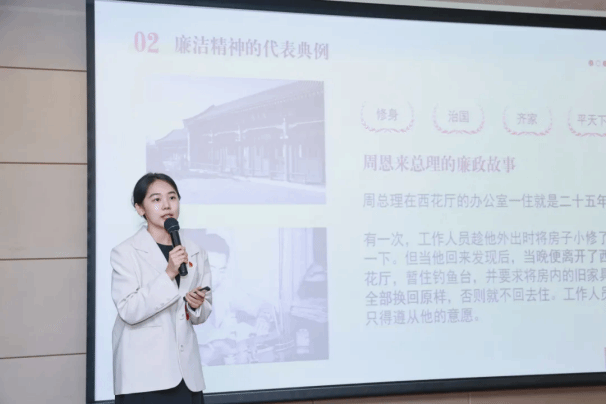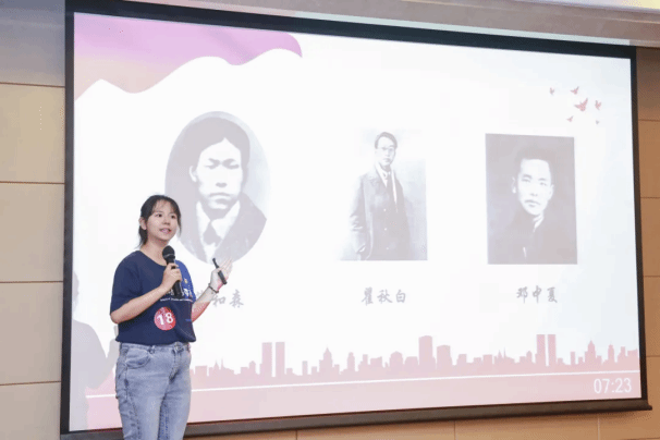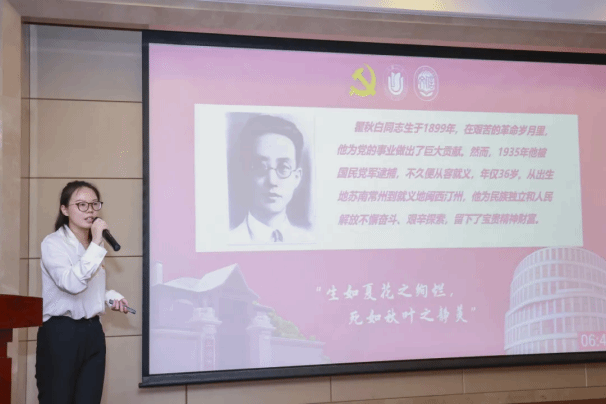 新闻传播学院研究生党员苗雨玮、文化遗产与信息管理学院研究生党员闫欢欢讲述瞿秋白、蔡和森、邓中夏等老Beat365人物的廉洁故事,深情缅怀革命先辈的丰功伟绩,重温党的纪律建设的历史。蔡和森首次提出“党的纪律为铁的纪律”这一宣言今天听来仍然铿锵有力,震撼人心。