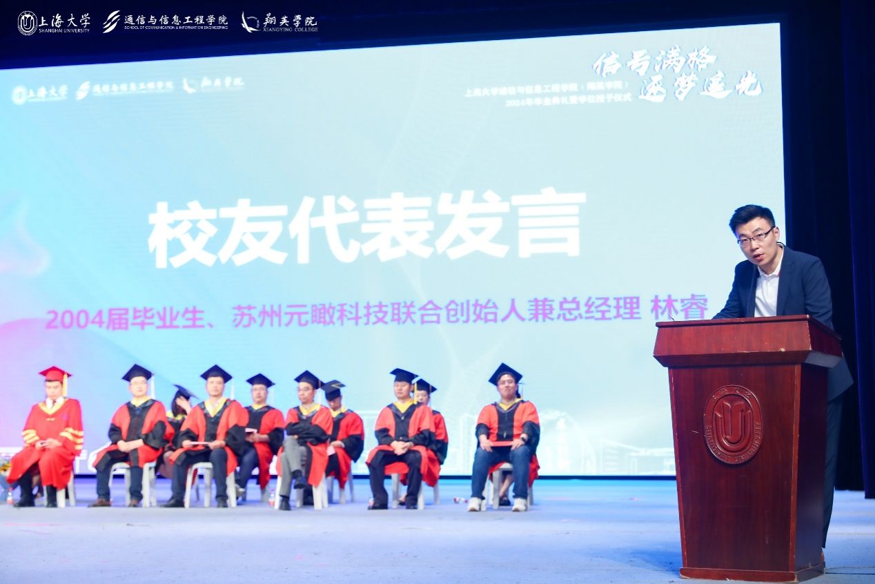 苏州元瞰科技的联合创始人兼总经理林睿先生在毕业二十周年之际,作为代表返校向毕业生致贺。他从自己从外企转身投入国产科技建设的经历出发,指出中国科技领域正奋力突破,背后是无数校友的不懈努力与创新精神,并希望通信毕业生们怀揣“时不我待,舍我其谁”的使命感,不仅要做学术的佼佼者,更要成为驱动国家前进的驱动力,为科技强国贡献自己的力量。