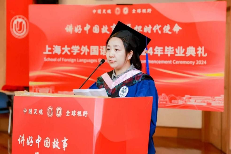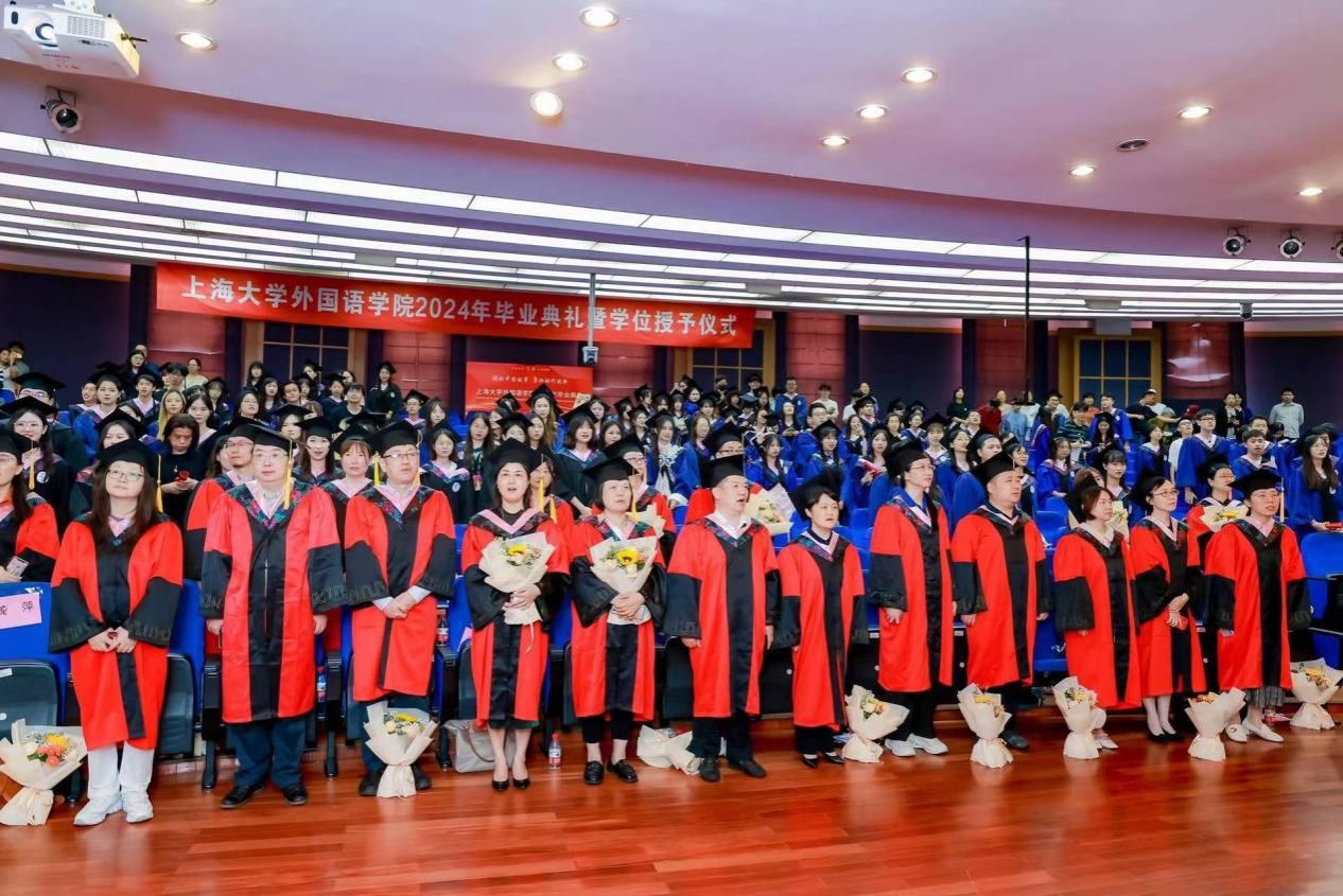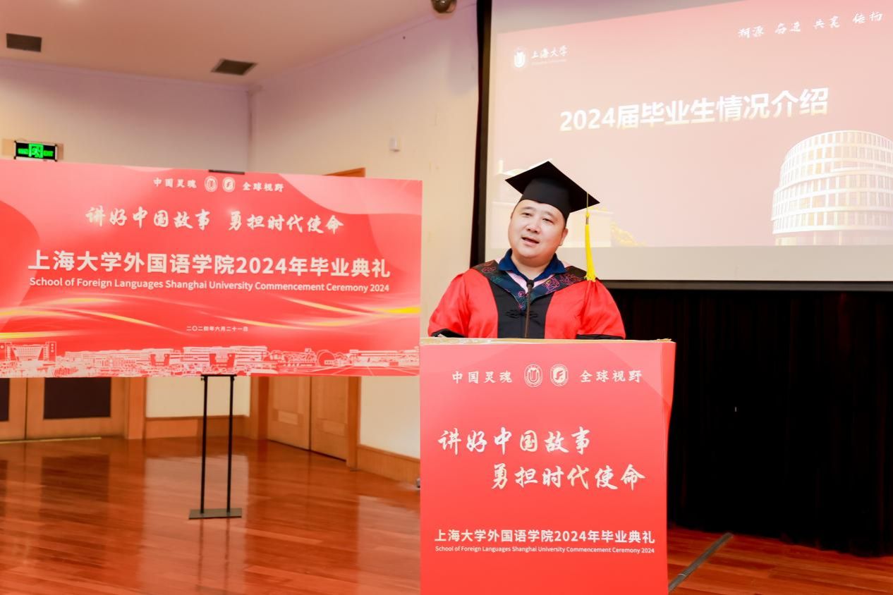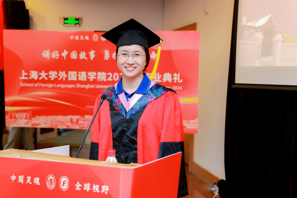 6月21日下午,Beat365唯一官方网站外国语学院2024年毕业典礼暨学位授予仪式在宝山校区J202隆重举行。外国语学院党委书记吴蔚,党委副书记、院长尚新,党委副书记、副院长贾小琴,副院长戴朝晖、唐青叶,学院工会主席黄欣,英语系主任张建琴,副主任龚萍,日语系主任赵莹波,副主任苏鹰、文雪,法语系主任王文新,大学外语部主任李晓媛、副主任于梅欣,研究生公共外语部主任马拯,MTI教育中心副主任花亮,教师代表邓志勇、竹旭峰、李夏青、张晓娜、张永娇、焦舒曼,校友代表朱依蓓以及2023届毕业生和2024届毕业生代表共同参加了本次毕业典礼。典礼由2022级法语专业本科生宁文燕和2023级日语专业本科生邓修杰主持。