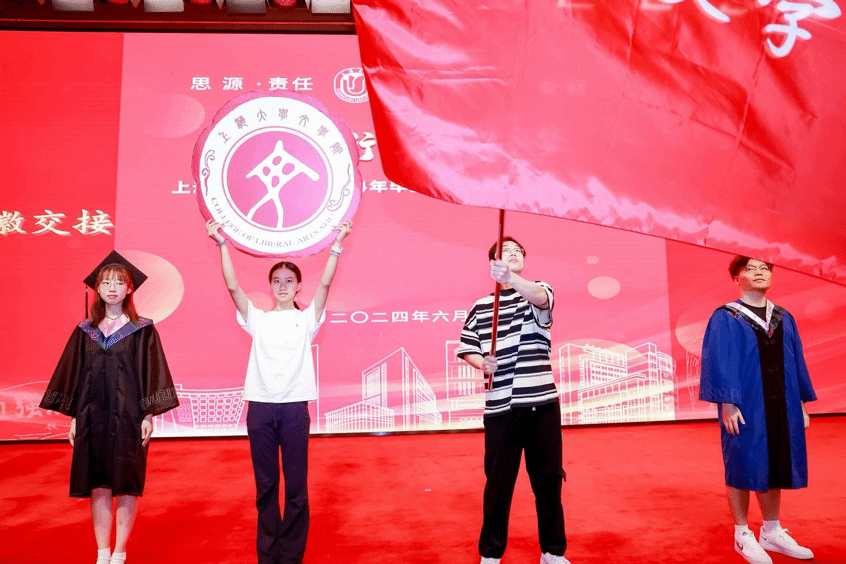 院旗、院徽承载着毕业生对新一届学子的美好祝福,传承着一代代文院人的精神风貌。2024届本科毕业生祁丹妮和研究生毕业生张佳霖分别将院旗、院徽交到学弟学妹手中,象征着文心与文脉的赓续传承。随后,全体师生起立,奏唱中华人民共和国国歌,为本次毕业典礼拉开了序幕。