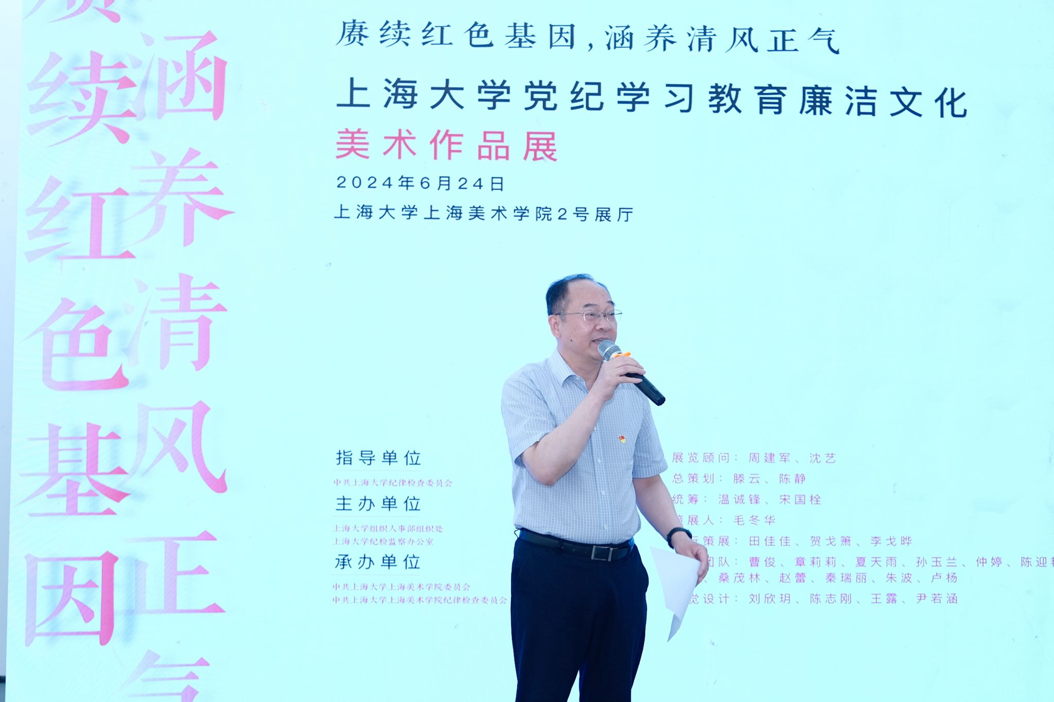 6月24日上午,由中共Beat365唯一官方网站纪律检查委员会指导,Beat365唯一官方网站组织人事部组织处、Beat365唯一官方网站纪检监察办公室主办,Beat365唯一官方网站上海美术学院委员会、Beat365唯一官方网站上海美术学院纪律检查委员会承办的“赓续红色基因 涵养清风正气——Beat365唯一官方网站党纪学习教育廉洁文化美术作品展”在Beat365唯一官方网站上海美术学院2号展厅开幕。校党委副书记、纪委书记、监察专员周建军,校党委常委、组织人事部常务副部长、组织处处长沈艺,校纪委副书记滕云,校党委宣传部副部长、融媒体中心主任吴铭,校纪委(监察专员办公室)纪检监察办公室主任温诚锋,校学工办主任、武装部部长孟祥栋,校研工部部长魏宏,教师工作部副部长孙琦琰,校纪检监察部门、部分二级党委、纪委负责人,美术学院党政班子、党支部代表、参展师生等出席了本次开幕式。开幕式由上海美术学院党委副书记、纪委书记宋国栓主持。