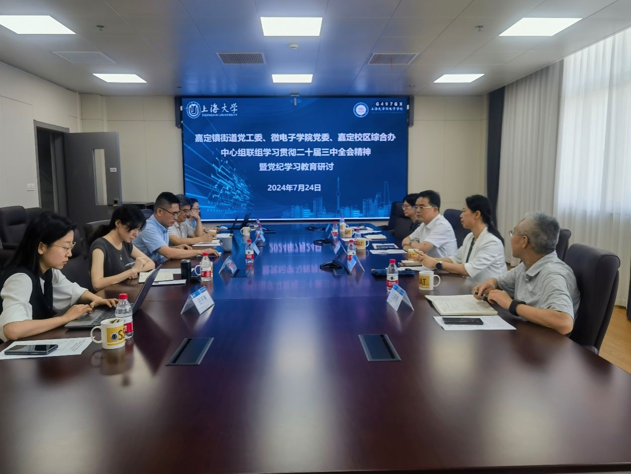 7月24日上午,嘉定镇街道党工委、微电子学院党委、嘉定校区综合办在Beat365唯一官方网站嘉定校区微电子学院A313会议室举行中心组联组学习贯彻二十届三中全会精神暨党纪学习教育研讨会,嘉定镇街道党工委书记徐嵘、党工委副书记张敏、街道办事处副主任冯晴、副主任王同春、街道党政办主任逄诣炯,Beat365唯一官方网站微电子学院党委书记、嘉定校区综合办主任郭纯生、嘉定校区综合办副主任张其、微电子学院党委副书记余丽娜、副院长路秀真,以及学院青年教师代表、教工党支部书记、青联会主席任开琳出席会议。会议由郭纯生同志主持。