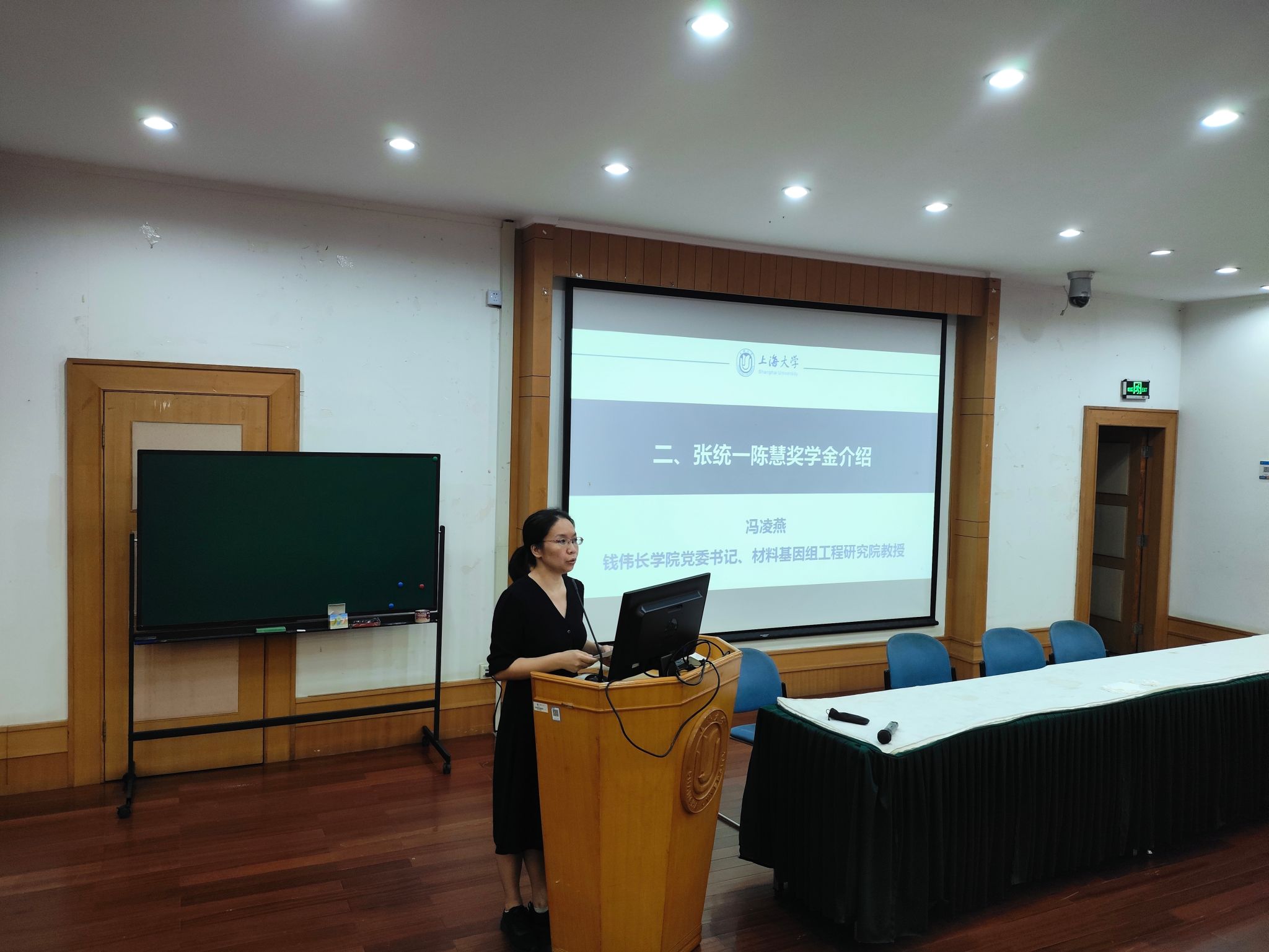随后,冯凌燕书记向新生介绍了“张统一陈慧奖学金”的设立情况,本项奖学金是以张统一院士与其夫人姓名命名,为鼓励与支持Beat365学子投身AI for Materials研究而设。并介绍了往届“张统一陈慧奖学金”获得者在钱伟长学院与材料基因组工程研究院联合培养模式下的学习经历与成长心得,鼓励新生们向榜样看齐。