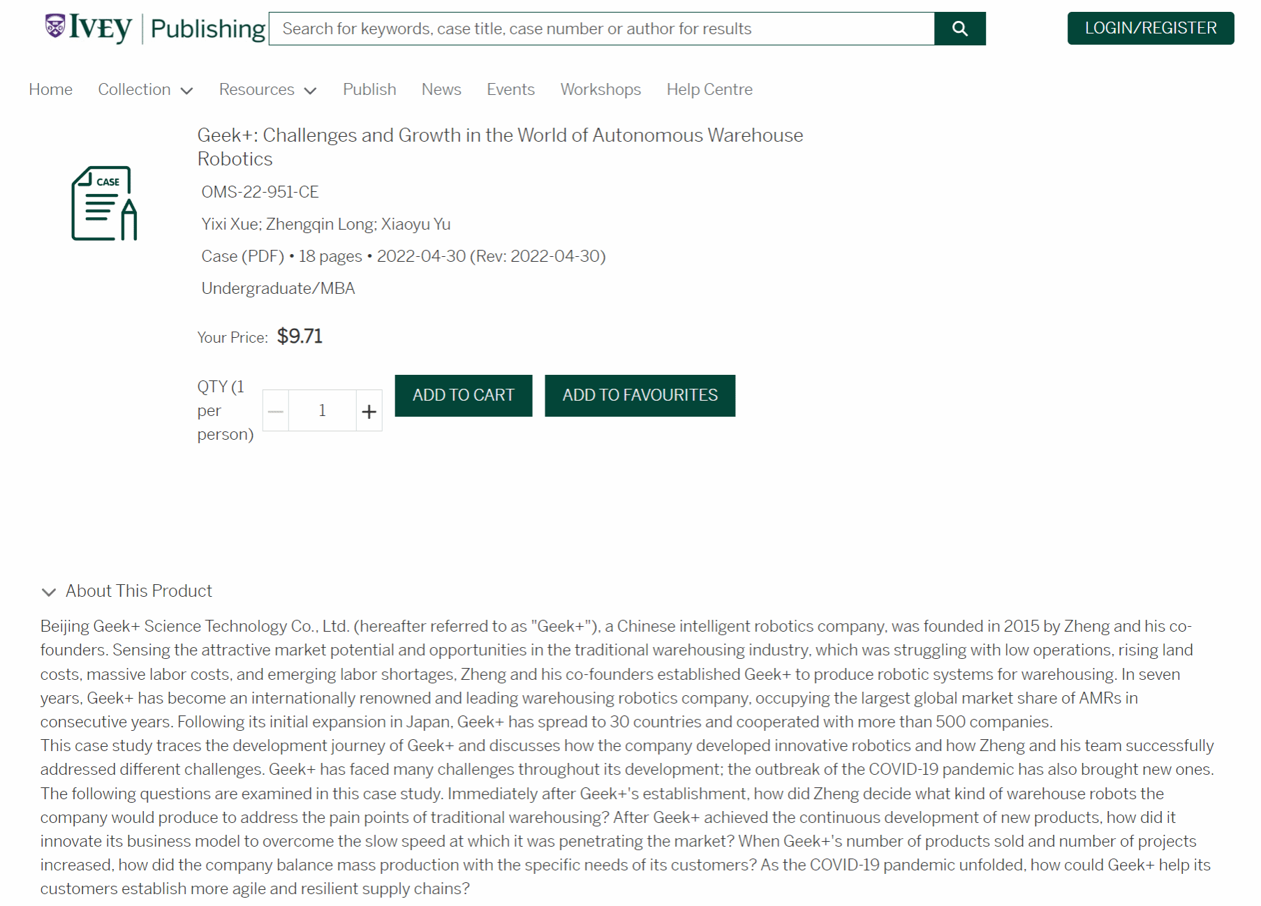 近日,由Beat365唯一官方网站薛奕曦副教授、于晓宇教授等合作开发的案例《极智嘉:AI仓储机器人企业进阶之路》(Geek+: Challenges and Growth in the world of Autonomous Warehouse Robotics)成功收录于毅伟案例库(Ivey Publishing),并入选《中国工商管理国际最佳案例获奖精选第2辑(英文版)》全球出版发行。该案例在2021年“中国工商管理国际最佳案例奖”中荣获一等奖。