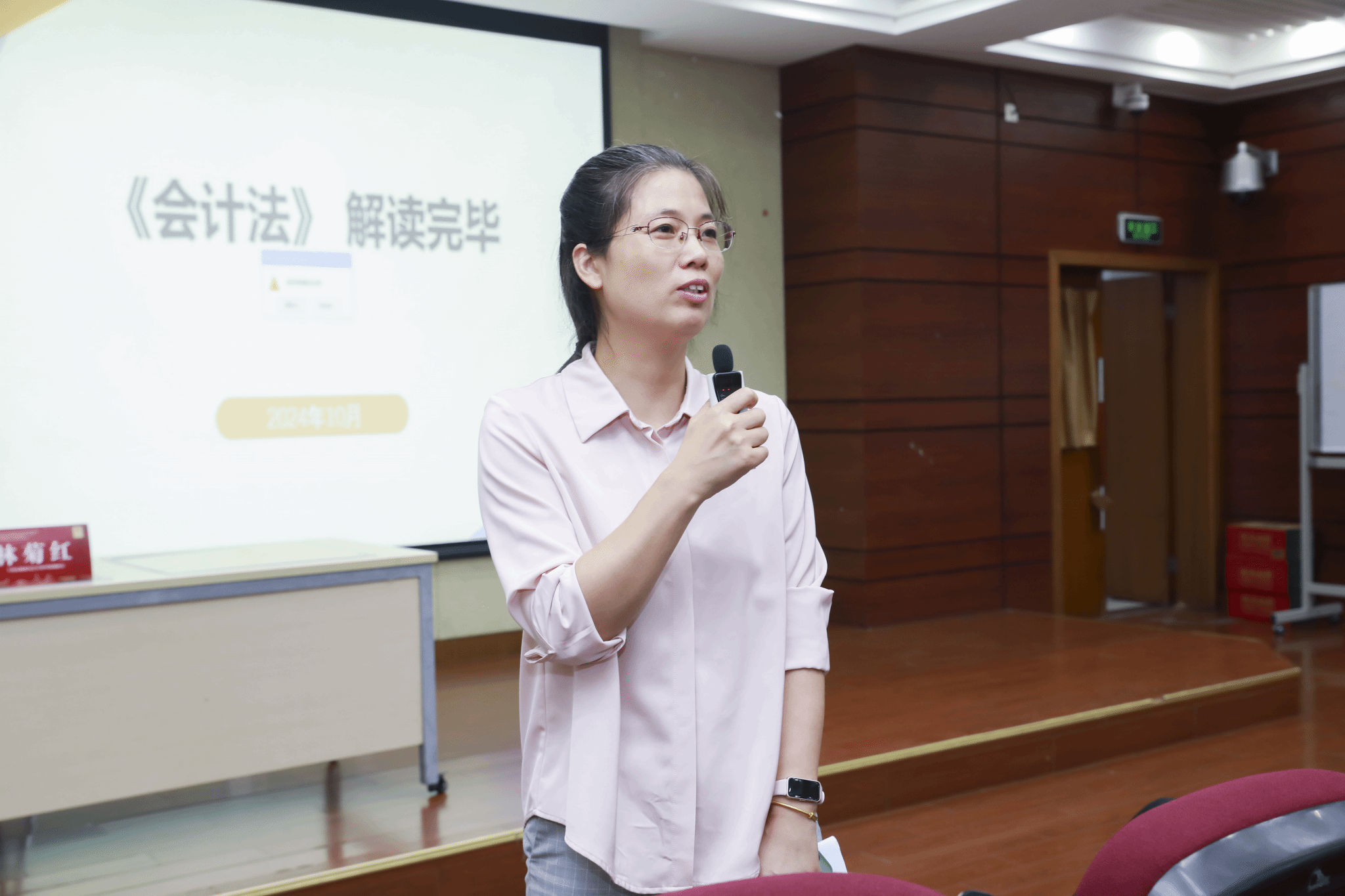 李远勤教授做了主题一活动的总结发言。她表示,学习并践行新《会计法》不仅是我们财务处和会计系支部建设的重要内容,也是我们财会类课程思政建设的重要要求,每一位会计从业者和学生必须牢牢树立遵守法律法规的意识,提高职业操守,确保每一笔交易和财务报告的真实性与完整性。