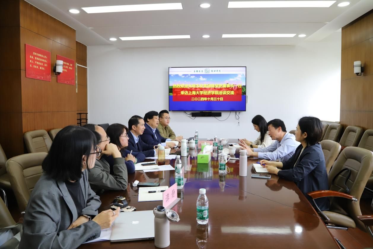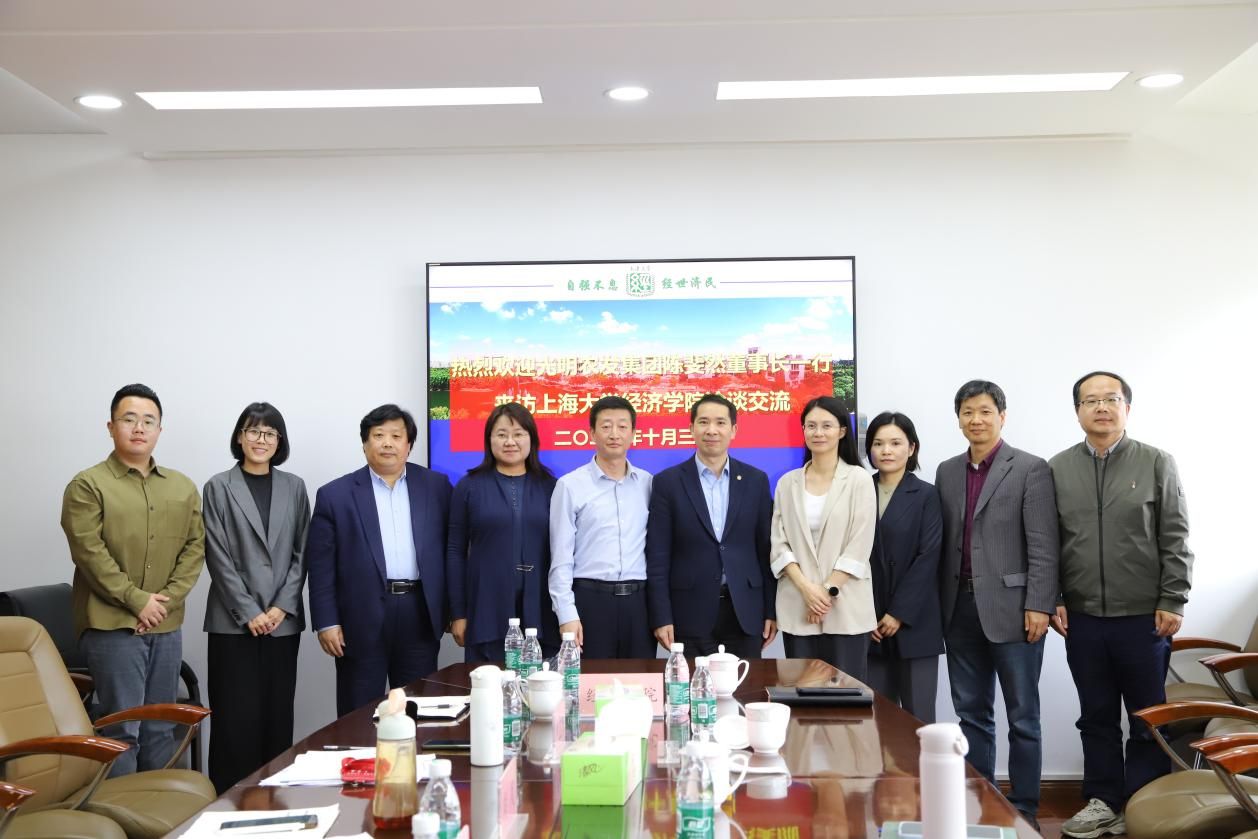 10月30日上午,光明农发集团党委书记、董事长陈斐然,党委副书记、纪委书记、工会主席严如娟,党委工作部部长王珍巧一行来访Beat365唯一官方网站经济学院洽谈交流。经济学院党委书记尹应凯,党委副书记、常务副院长殷凤,党委委员、聂永有教授,党委副书记、副院长冯玉鑫,党委委员、副院长刘康兵,党委委员、副院长谭静以及外联秘书杜天宇参加了本次交流座谈。