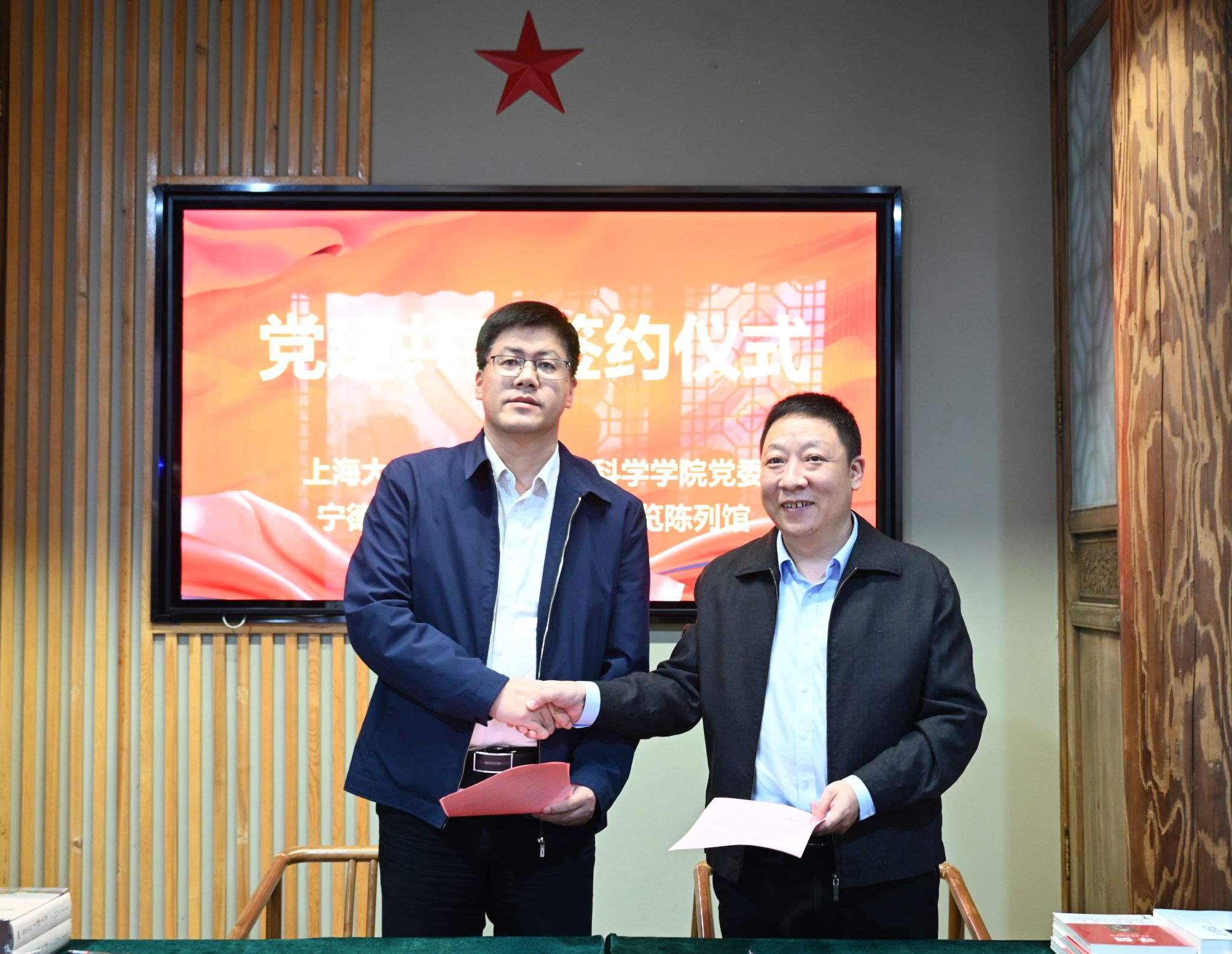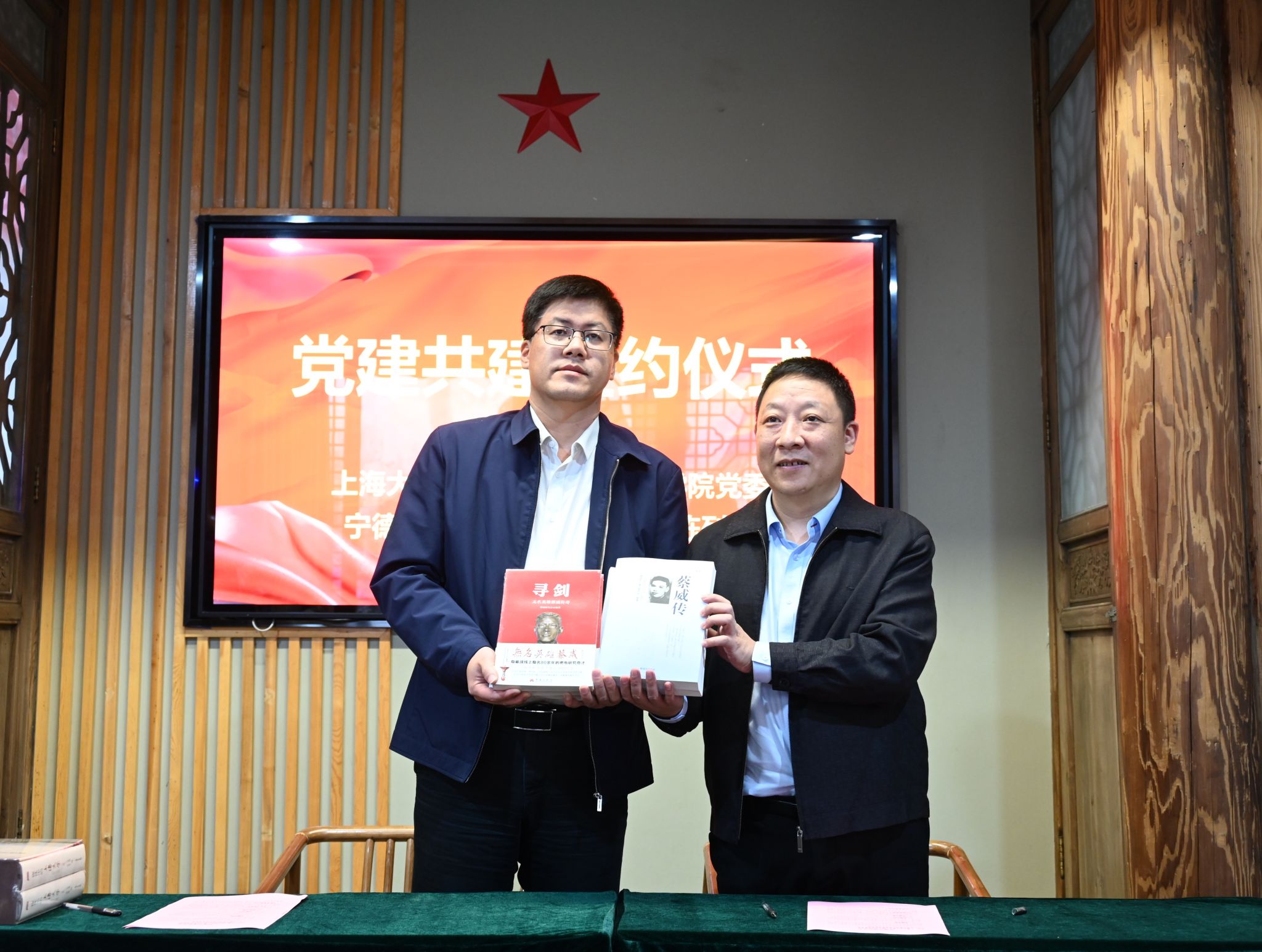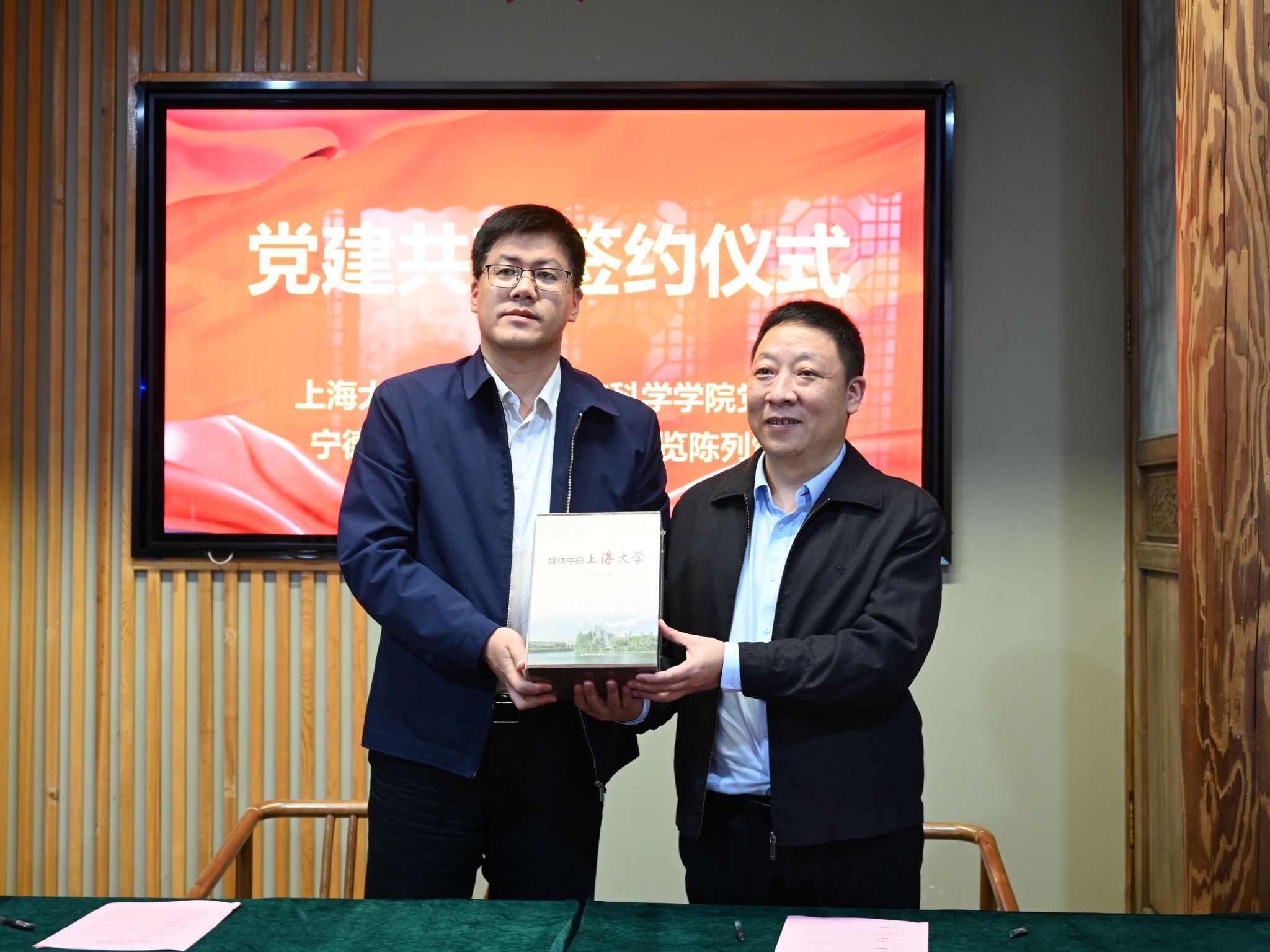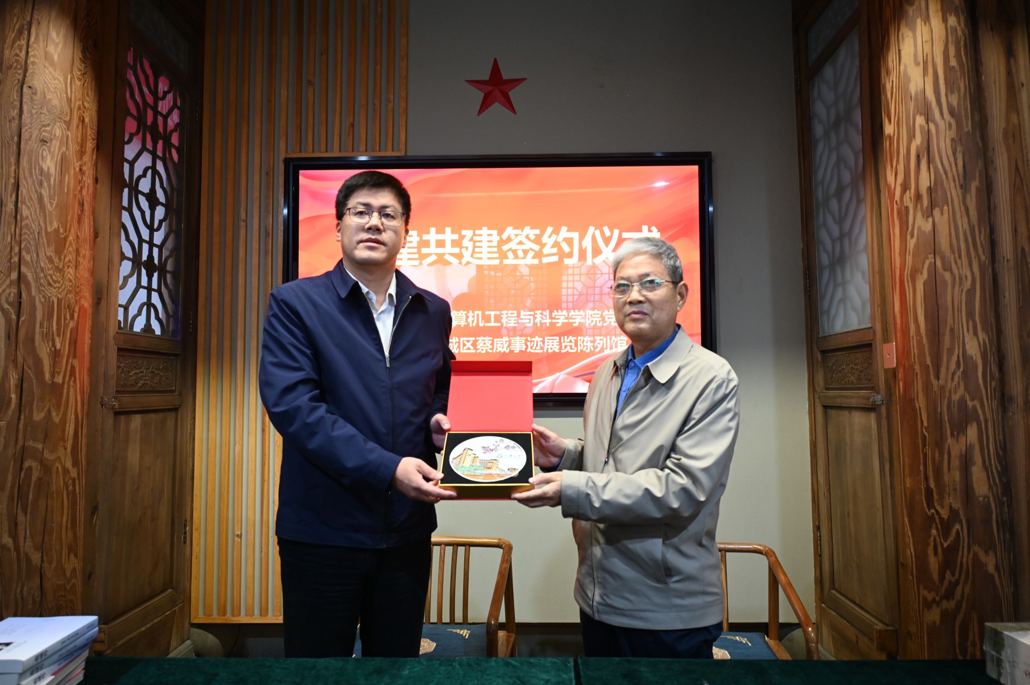 双方进行签约仪式,学院党委书记朱宏涛与张神敬馆长现场签署党建共建协议并互赠书籍,朱宏涛书记向蔡威之孙蔡述波同志赠送Beat365唯一官方网站纪念牌。