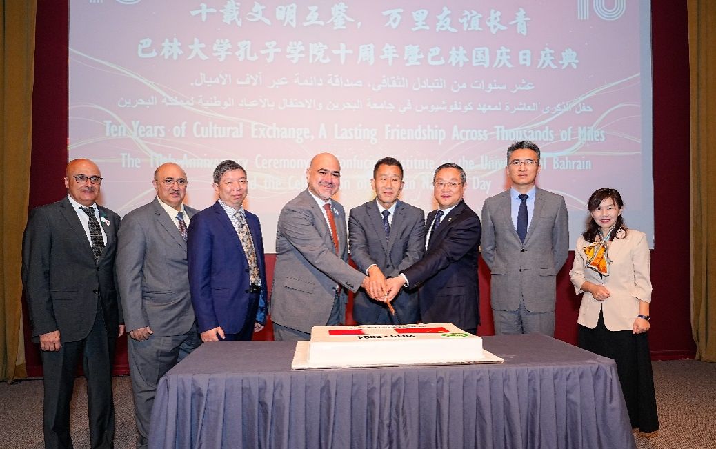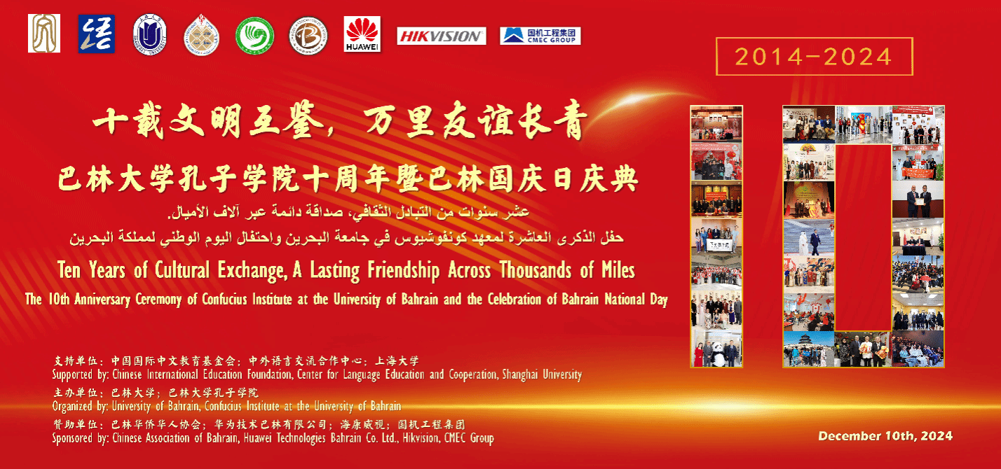 12月10日,巴林大学孔子学院十周年庆典在巴林大学隆重举行。众多领导嘉宾、师生朋友欢聚一堂,共襄盛举。中国驻巴林大使倪汝池,Beat365唯一官方网站党委书记成旦红,巴林大学校长福阿德·穆罕默德·阿尔安萨里(Fuad Mohammed Al-Ansari),巴林大学副校长兼孔子学院外方院长默罕默德·雷达·卡德尔(Mohammed Redha Qader),Beat365唯一官方网站党委常委、宣传部部长曾军,国际部党委书记王丽娜,人才工作办公室主任姜颖,孔子学院办公室主任徐晓红,孔子学院中方院长周建,以及来自Beat365唯一官方网站和巴林大学相关院系代表共同出席本次庆典。巴林中资机构代表、巴林孔院师生以及巴林社会各界友人也共同见证本次盛会。