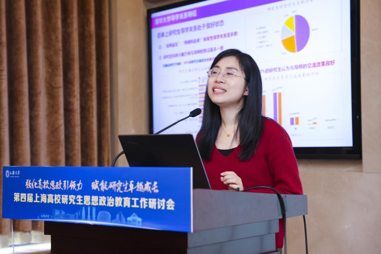 上海对外经贸大学法学院党委书记乔檀作《弘扬导学共进文化,培育卓越研究生导学团队》主题分享,介绍了学校通过“双系统”协同联动,推动思想政治教育的实施。她还阐述了学校如何通过“导学共进”文化,增强师生间的情感交流和价值共鸣,从而激发师生的创新实践能力。