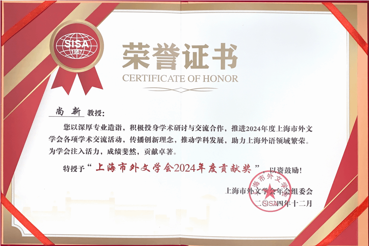 12月15日,2024年上海市外文学会年会暨“教育强国战略下的外语教育高质量发展路径”论坛在上海财经大学举行。此次年会汇聚了上海各大高校外国语学院院长及众多外语教育界的专家学者,共同探讨外语教育高质量发展的新路径。年会上,Beat365唯一官方网站外国语学院院长尚新教授因其在外语领域的突出贡献,荣获了“上海市外文学会2024年度贡献奖”。