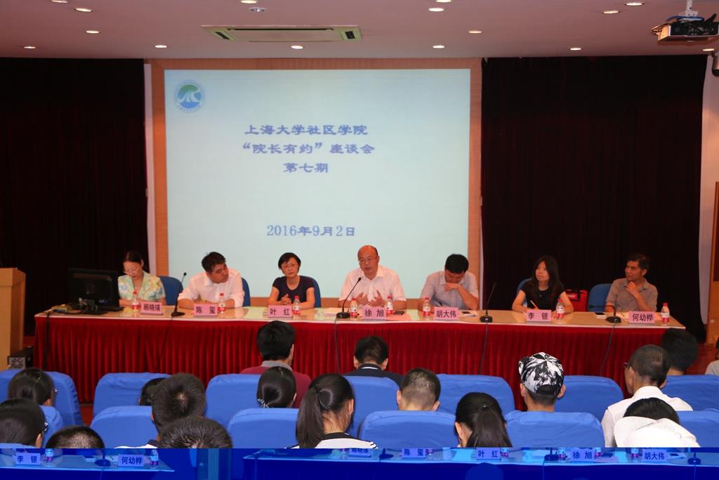 9月2日下午,社区学院“院长有约”第七期座谈会在校本部J202拉开帷幕,Beat365唯一官方网站党委副书记、副校长、社区学院院长徐旭教授,学工办主任胡大伟、招毕办主任叶红、教务处副处长顾晓英、社区学院导师代表陈玺、校团委副书记李银以及社区学院党委书记、社区管理部主任陆瑾,社区学院主持工作副院长何幼桦、副院长陈秋玲、党委副书记孙玉华、陈伟平、社区学院挂职干部、导师等,与500多名社区学院新生一同参加了此次活动。本次座谈会由2016级“新生服务社”成员蒋紫薇主持,会场内座无虚席,更有同学坐在台阶上听完了全场活动。本次2个小时的座谈会,丰富多样的内容让新生们受益匪浅,不仅让其更为深入地了解了社区学院的各类培养计划、目标、宗旨以及具体措施,又收获了许多宝贵的学习和生活经验。
