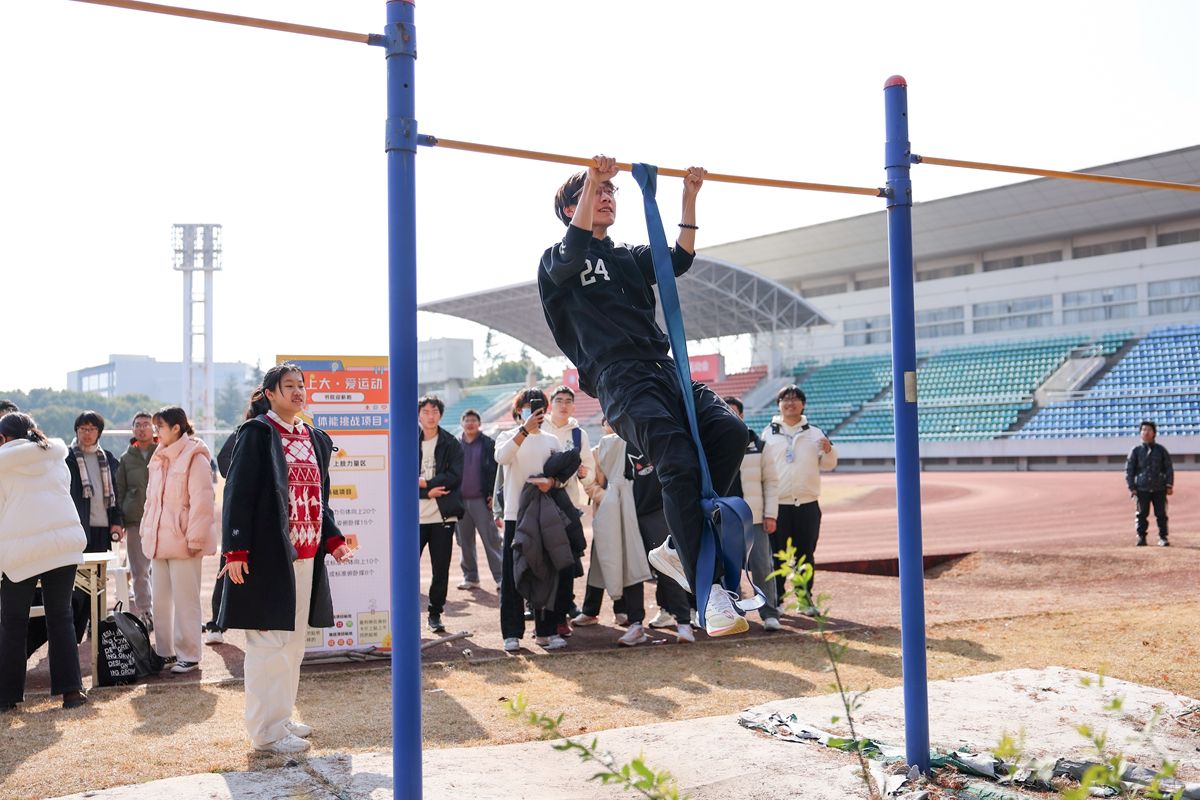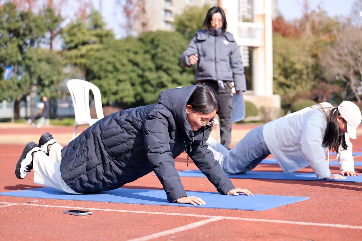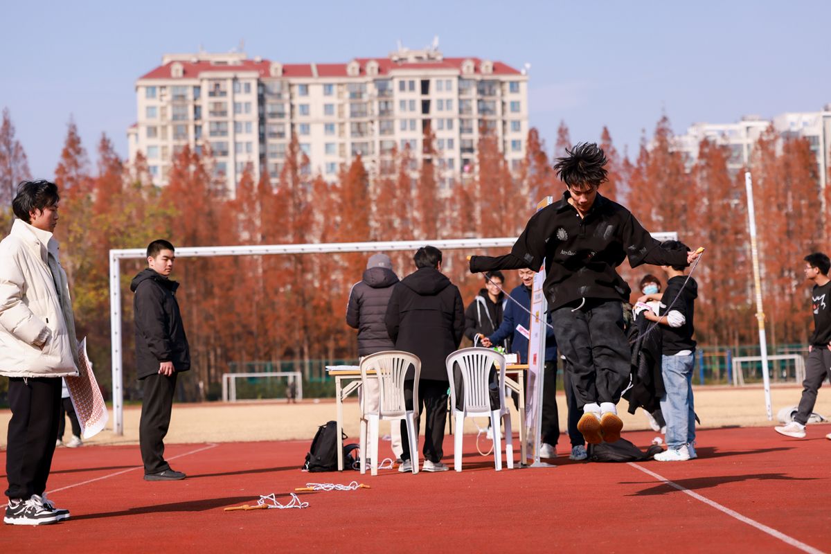 体能挑战区则设置了上肢力量区、下肢力量区和有氧练习区三个站点,同学们将挑战引体向上、俯卧撑、螃蟹走、波比跳和跳绳等项目,全面提升身体素质,锻炼力量与耐力。