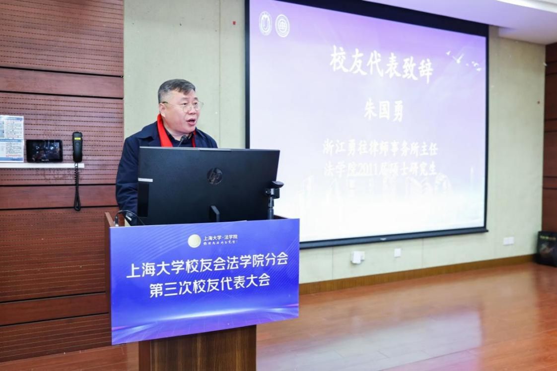 2011届硕士研究生、浙江勇往律师事务所主任朱国勇校友作为校友代表致辞。朱国勇校友回顾自身的成长历程,感谢母校、恩师的培养,表示会奋发作为,争取为学校学院发展作出更多的贡献。