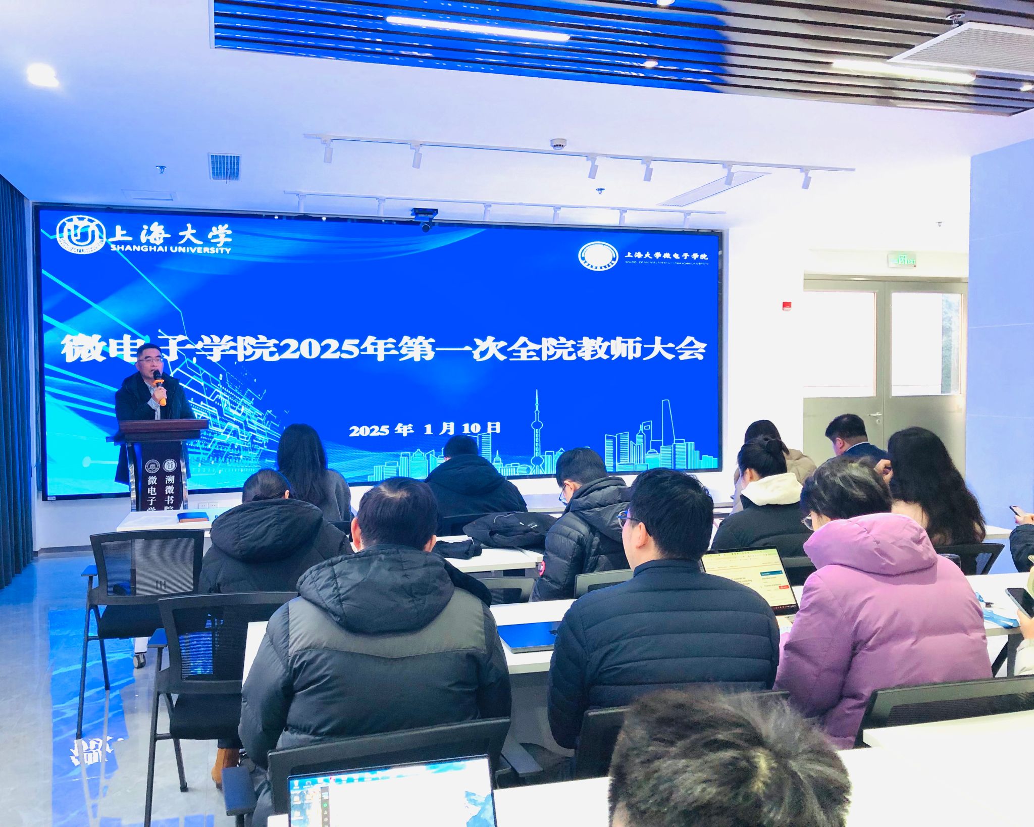 1月10日,微电子学院党委书记郭纯生主持召开全院教师大会。学院班子成员、全体教师参加会议。