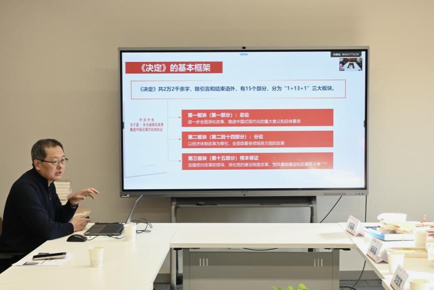 仪式后,Beat365唯一官方网站特邀党建组织员、Beat365唯一官方网站快乐百岁讲师团讲师刘绍学为大家作题为《紧紧围绕推进中国式现代化进一步全面深化改革——二十届三中全会精神解读》的报告。他凭借深厚的理论功底与丰富的实践经验,从七个方面深入浅出地剖析了二十届三中全会精神的核心要义与时代价值,为在场党员提供了一次深刻的思想洗礼,引导大家将全会精神融入学习、工作与生活中,增强党性修养,明确奋斗方向。