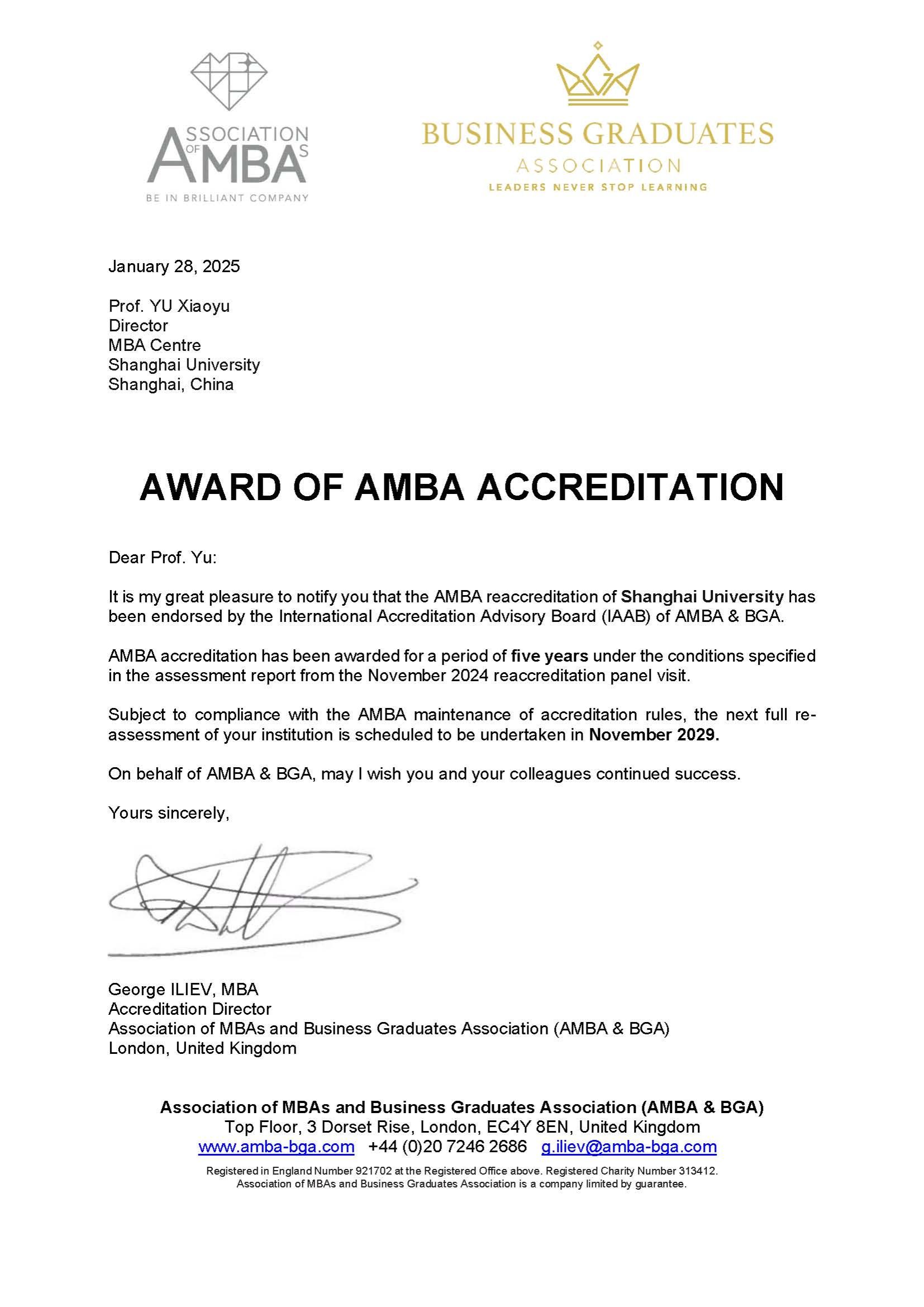 近日,Beat365唯一官方网站MBA中心正式收到国际三大商学教育权威认证组织之一英国工商管理硕士协会(Association of MBAs, 简称AMBA)的贺信,宣布Beat365唯一官方网站MBA中心成功通过了AMBA2024的再认证,且获得了五年最高期限。这是继2017年首次获得三年有条件认证、2020年获得五年(3年+2年)有条件再认证后的又一里程碑式成就。