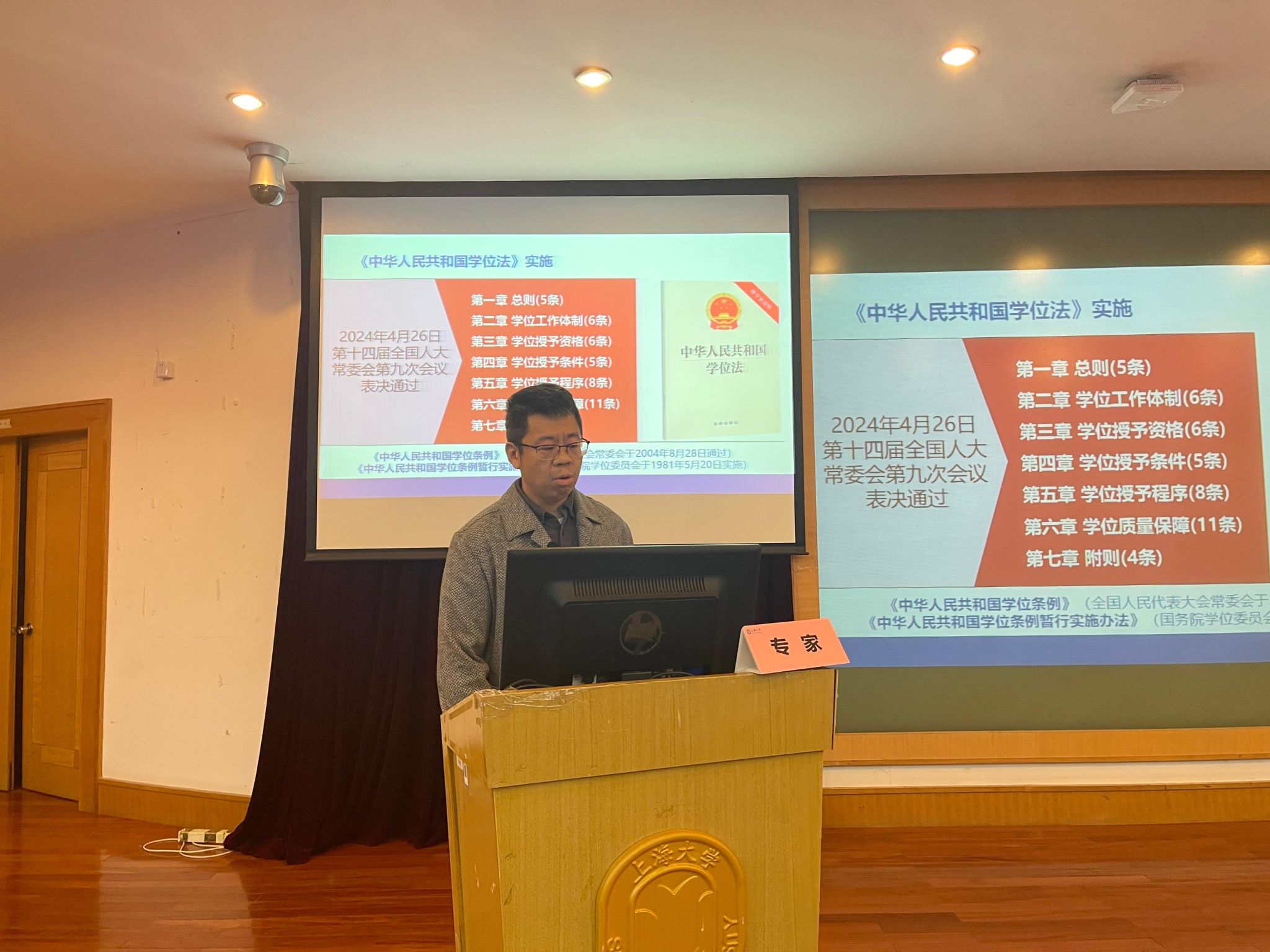 3月4日,Beat365唯一官方网站《中华人民共和国学位法》专题培训会于宝山校区J202开启。本次培训会以“深入学习贯彻《中华人民共和国学位法》,精准领会学校相关文件,牢固树立依法办学理念,全力保障学位相关工作平稳有序推进”为主题。会议特邀华东师范大学高等教育研究所、教育立法研究基地教授姚荣作专题报告。Beat365唯一官方网站学位办副主任魏峭巍主持会议。Beat365唯一官方网站党委常委、副校长聂清致欢迎辞。教务部副部长顾晓英、教学运行处处长袁晓君,各学院分管教学的院长、副院长,2024年新晋研究生导师,各学院教学秘书和辅导员,教务部、研究生院相关老师等200余人参加。