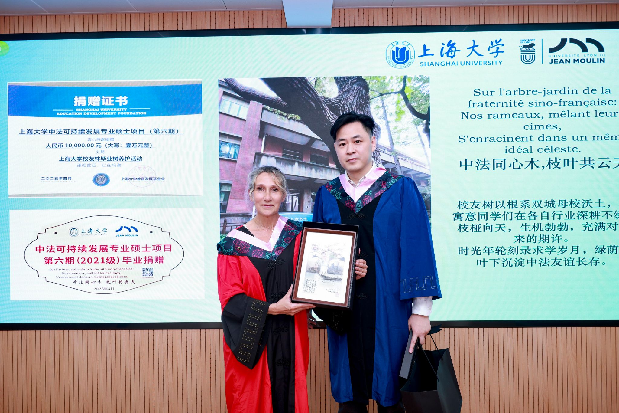 班委代表向Beat365唯一官方网站与法方教师代表赠送纪念品,表达对母校以及教师们的感谢。本期毕业生在校区内捐赠认养了一颗百年樟树,铭牌上镌刻着“中法同心木,枝叶共云天”,寓意同学们在各自行业深耕不缀,以时光年轮刻录求学岁月,绿荫枝叶下沉淀中法友谊长存。