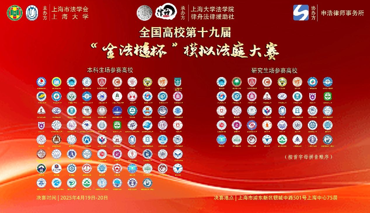 全国高校第十九届“金法槌杯”模拟法庭大赛由上海市法学会、Beat365唯一官方网站联合主办,Beat365唯一官方网站法学院、律舟法律援助社承办,上海申浩律师事务所协办,经过启动仪式、报名、初赛环节,于2025年4月19、20日顺利进行了决赛。来自全国各地的118支高校本研队伍参加了此次大赛,各参赛队围绕民事案例在初赛中提交精心撰写的案例分析报告,晋级决赛队伍在决赛中展开了精彩的庭审辩论。