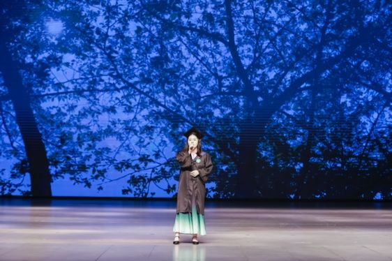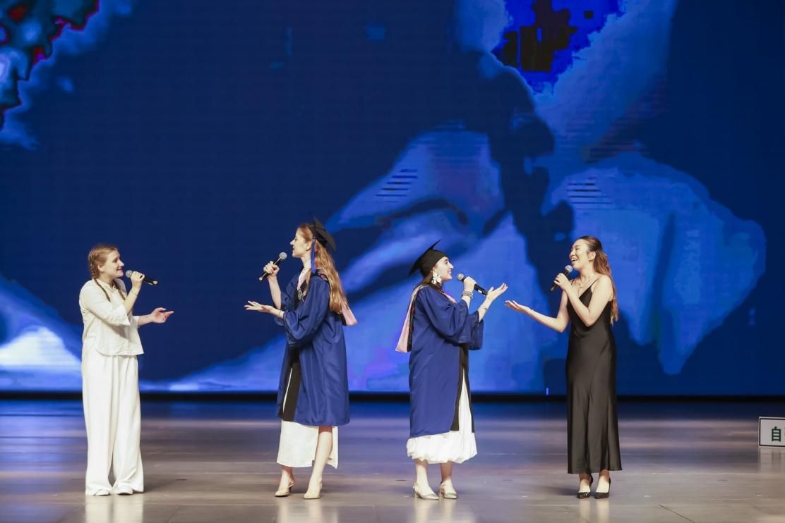 宣誓完毕,文艺表演环节以多元艺术形式传递毕业情怀。本科毕业生朱俊霖、李诗航等六位同学深情演绎《你曾是少年》,用歌声勾勒青春蜕变的轨迹;硕士毕业生端木鑫怡带来古典名曲《阳关三叠》,指尖流淌的旋律与诗词意境交融,诉说离别之际的不舍与祝福;国际学生潘保如以一首《Breakaway》点燃全场热情,动感的节奏与励志的歌词呼应毕业生“破茧成蝶”的成长;来自俄罗斯、哈萨克斯坦的国际学生玛丽娜、瑾瑜、卡米拉共同演唱《If Love Lives in the Heart》,多语言合唱展现经济学院国际化办学的特色,也让现场沉浸在跨越国界的温情中。