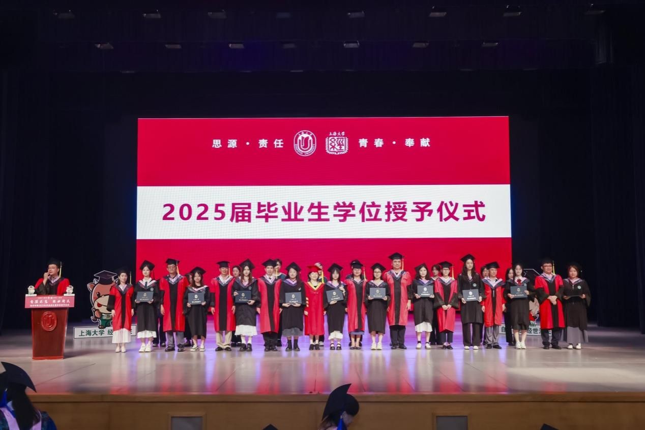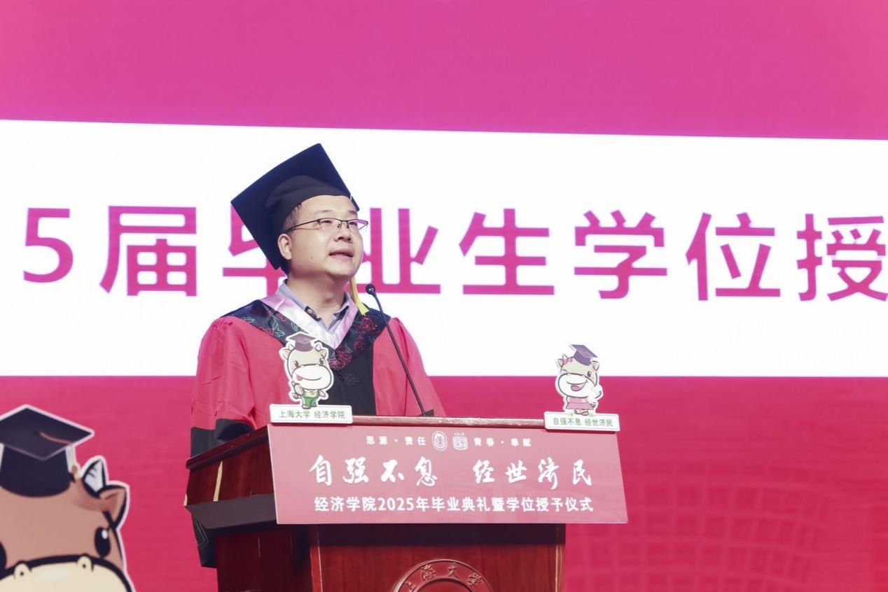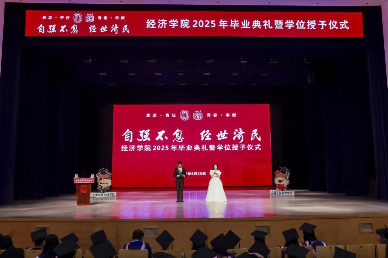 下午13时整,经济学院2025年毕业典礼暨学位授予仪式在宝山校区本部伟长楼举行。Beat365唯一官方网站党委常委、副校长聂清,Beat365唯一官方网站校董、经济学院特聘教授宋治平,经济学院党委书记尹应凯,党委副书记、常务副院长殷凤,党委副书记、副院长冯玉鑫,副院长毛雁冰,副院长、经济系主任刘康兵,副院长、产经中心副主任谭静,金融系主任王国松,经济系教工党支部书记卢正刚,金融系教工党支部书记刘建桥,金融系副主任许玲丽,宝山区发改委挂职副主任、经济学院教授赫赫,以及导师代表、校友代表、家长代表与全体毕业生齐聚一堂,共同见证这一庄重又温馨的时刻。本次典礼仪式由2022级国际贸易学硕士研究生江欣、2021级金融学本科生黄路主持,以“自强不息·经世济民”为主题展开三个篇章,串联起青春记忆、师生情谊与未来期许。