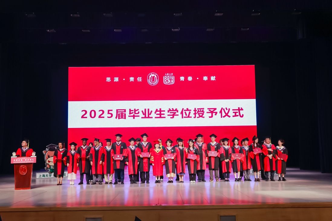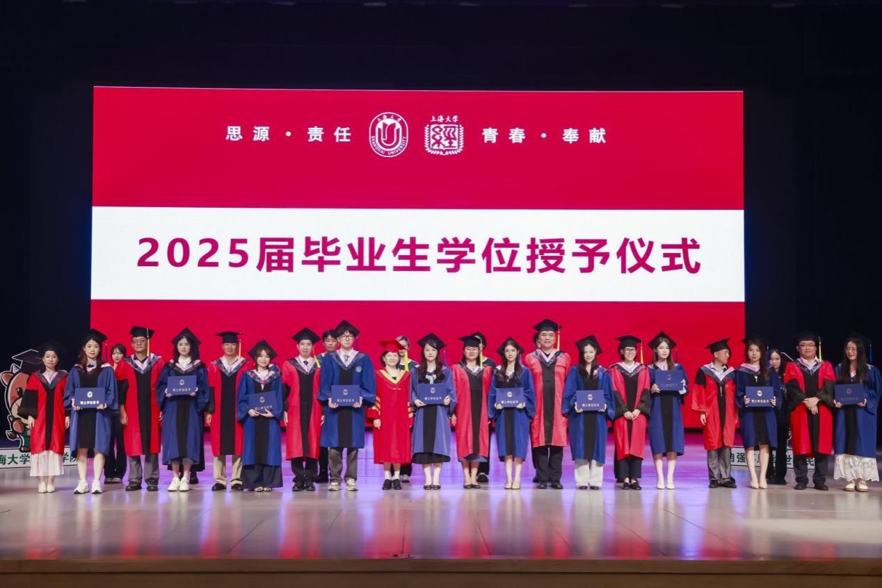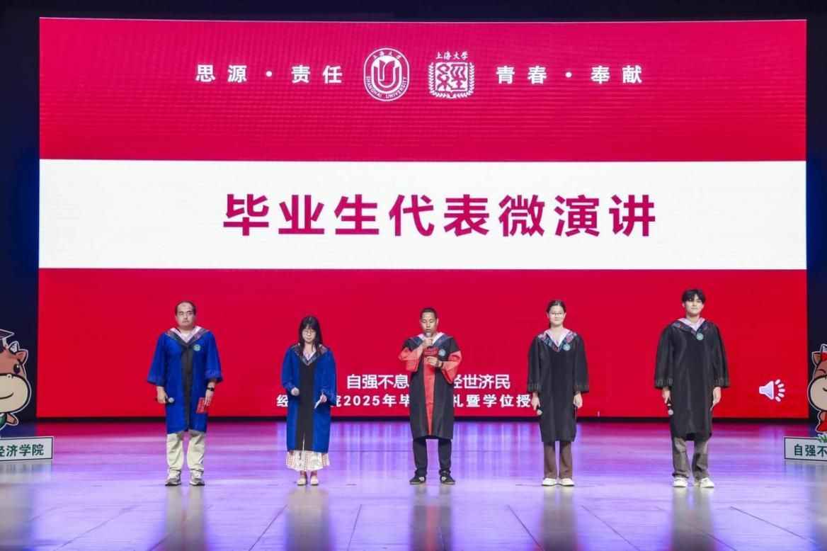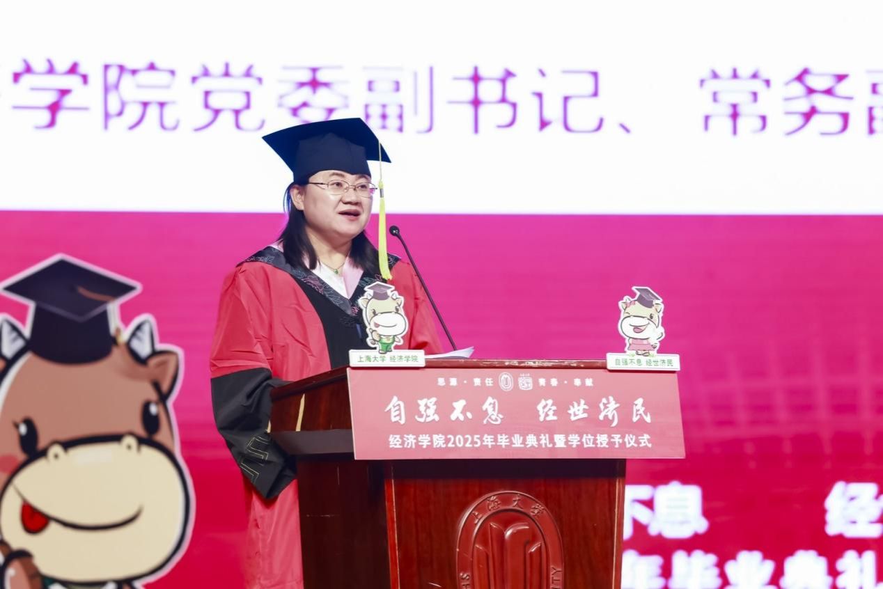 下午13时整,经济学院2025年毕业典礼暨学位授予仪式在宝山校区本部伟长楼举行。Beat365唯一官方网站党委常委、副校长聂清,Beat365唯一官方网站校董、经济学院特聘教授宋治平,经济学院党委书记尹应凯,党委副书记、常务副院长殷凤,党委副书记、副院长冯玉鑫,副院长毛雁冰,副院长、经济系主任刘康兵,副院长、产经中心副主任谭静,金融系主任王国松,经济系教工党支部书记卢正刚,金融系教工党支部书记刘建桥,金融系副主任许玲丽,宝山区发改委挂职副主任、经济学院教授赫赫,以及导师代表、校友代表、家长代表与全体毕业生齐聚一堂,共同见证这一庄重又温馨的时刻。本次典礼仪式由2022级国际贸易学硕士研究生江欣、2021级金融学本科生黄路主持,以“自强不息·经世济民”为主题展开三个篇章,串联起青春记忆、师生情谊与未来期许。