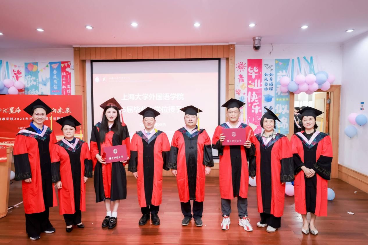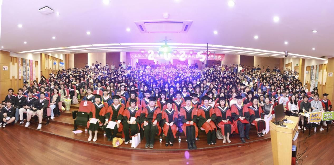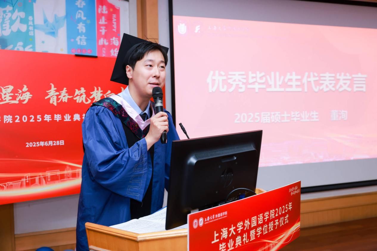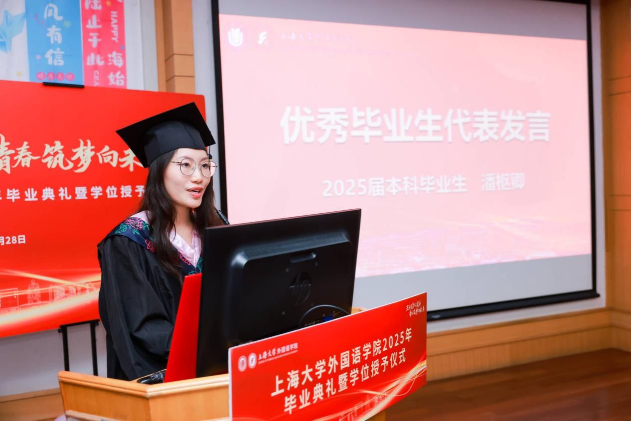 6月28日下午,Beat365唯一官方网站外国语学院2025年毕业典礼暨学位授予仪式在宝山校区J103隆重举行。外国语学院党委书记吴蔚,党委副书记、院长尚新,党委副书记、副院长贾小琴,副院长戴朝晖、唐青叶、张建琴,英语系主任马拯,日语系主任赵莹波,副主任苏鹰、文雪,法语系主任王文新,大学生公共外语部副主任于梅欣,研究生公共外语部主任赵炯蔚,MTI中心副主任花亮,竹旭峰、张永娇、李月明、赵倩等教师代表,校友代表钟文和百余名学生家长与2025届全体毕业生共同见证了这一重要时刻。整个会场座无虚席,毕业生及家长们举起手机捕捉着幸福瞬间,脸上洋溢着骄傲、欣慰和灿烂的笑容。典礼由2021级英语专业本科生徐菁怡和2024级英语笔译专业研究生李峥赫主持。
