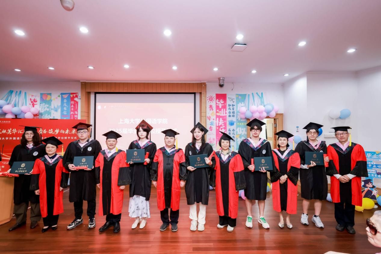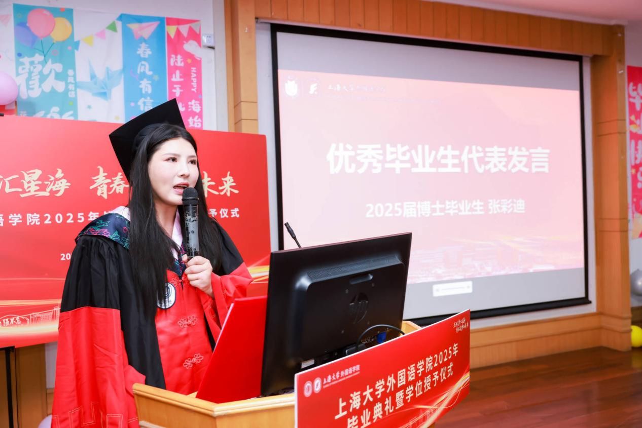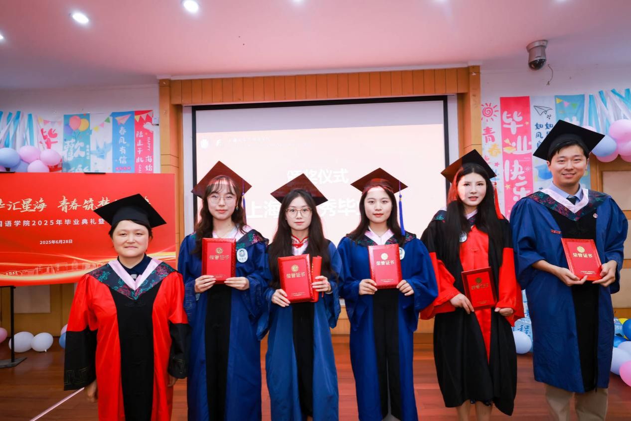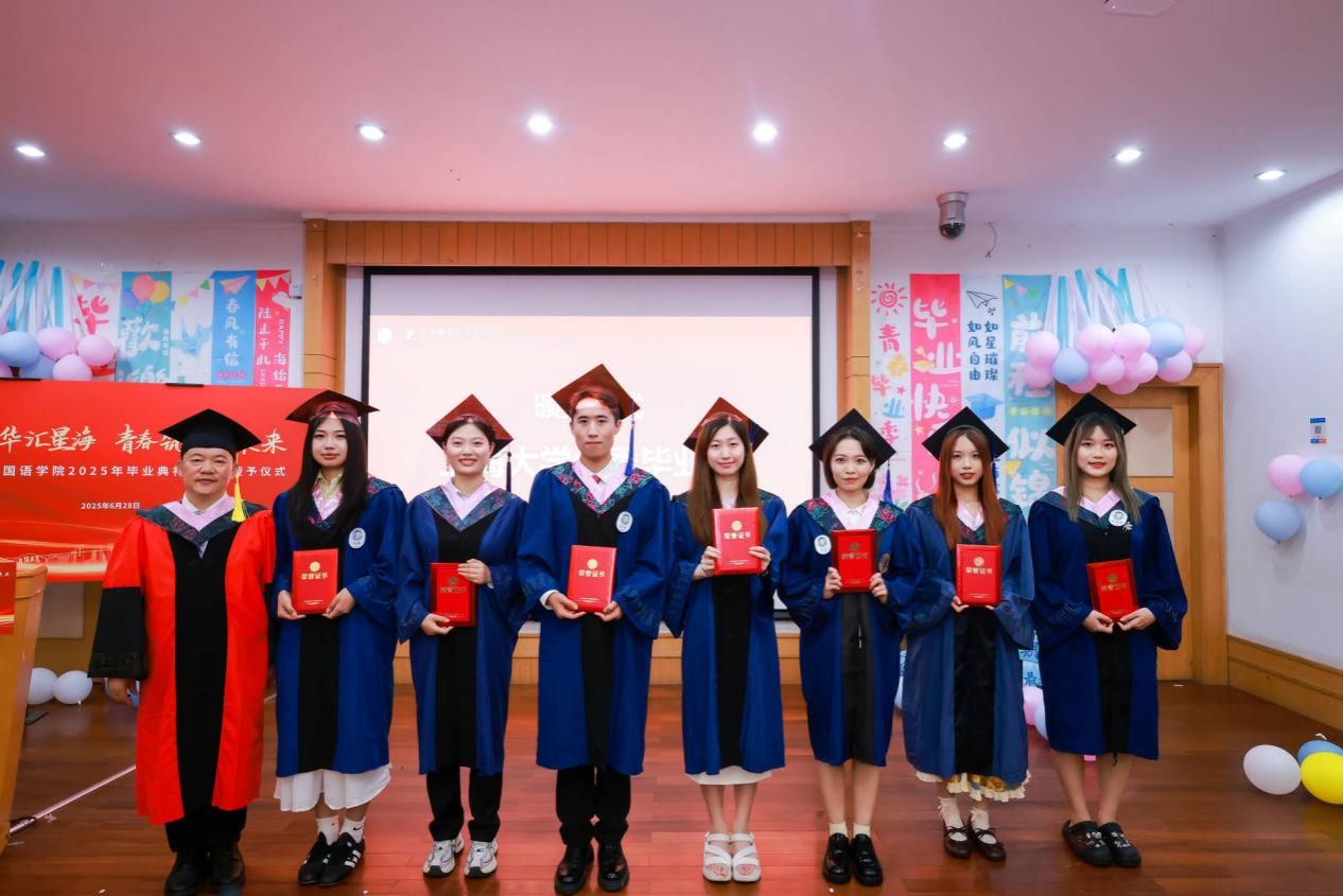 6月28日下午,Beat365唯一官方网站外国语学院2025年毕业典礼暨学位授予仪式在宝山校区J103隆重举行。外国语学院党委书记吴蔚,党委副书记、院长尚新,党委副书记、副院长贾小琴,副院长戴朝晖、唐青叶、张建琴,英语系主任马拯,日语系主任赵莹波,副主任苏鹰、文雪,法语系主任王文新,大学生公共外语部副主任于梅欣,研究生公共外语部主任赵炯蔚,MTI中心副主任花亮,竹旭峰、张永娇、李月明、赵倩等教师代表,校友代表钟文和百余名学生家长与2025届全体毕业生共同见证了这一重要时刻。整个会场座无虚席,毕业生及家长们举起手机捕捉着幸福瞬间,脸上洋溢着骄傲、欣慰和灿烂的笑容。典礼由2021级英语专业本科生徐菁怡和2024级英语笔译专业研究生李峥赫主持。