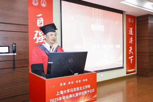 6月28日下午,“风华耀马院,青春启新程”Beat365唯一官方网站马克思主义学院2025年毕业典礼暨学位授予仪式在宝山校区东区蔡冠深讲堂隆重举行。Beat365唯一官方网站党委书记成旦红,马克思主义学院党委书记王国建,党委副书记、主持工作副院长叶海涛等学院领导班子成员,20余位导师代表,2025届毕业生及亲友代表、在校学生代表等齐聚一堂,共襄盛会。典礼由马克思主义学院2023级本科生刘万珅、陈慕阳主持。