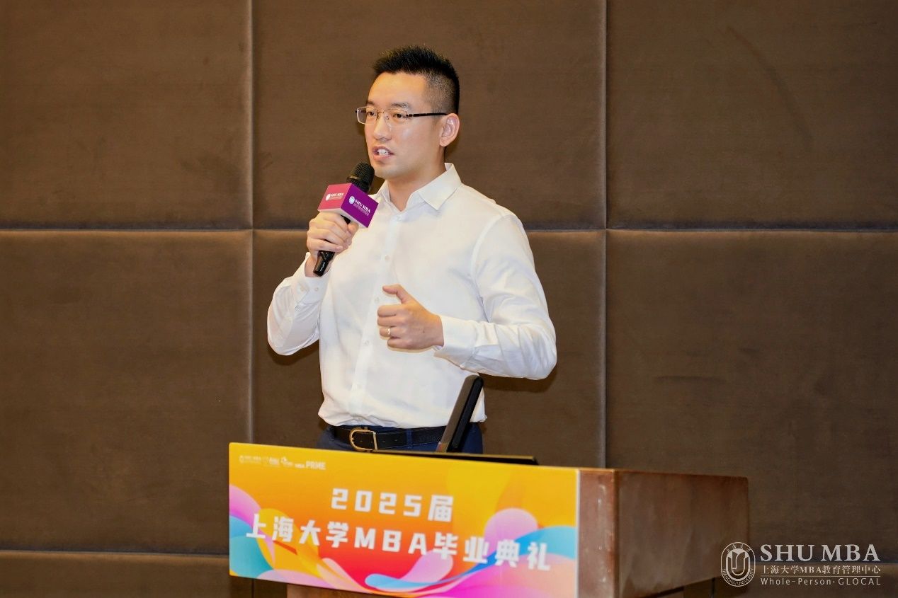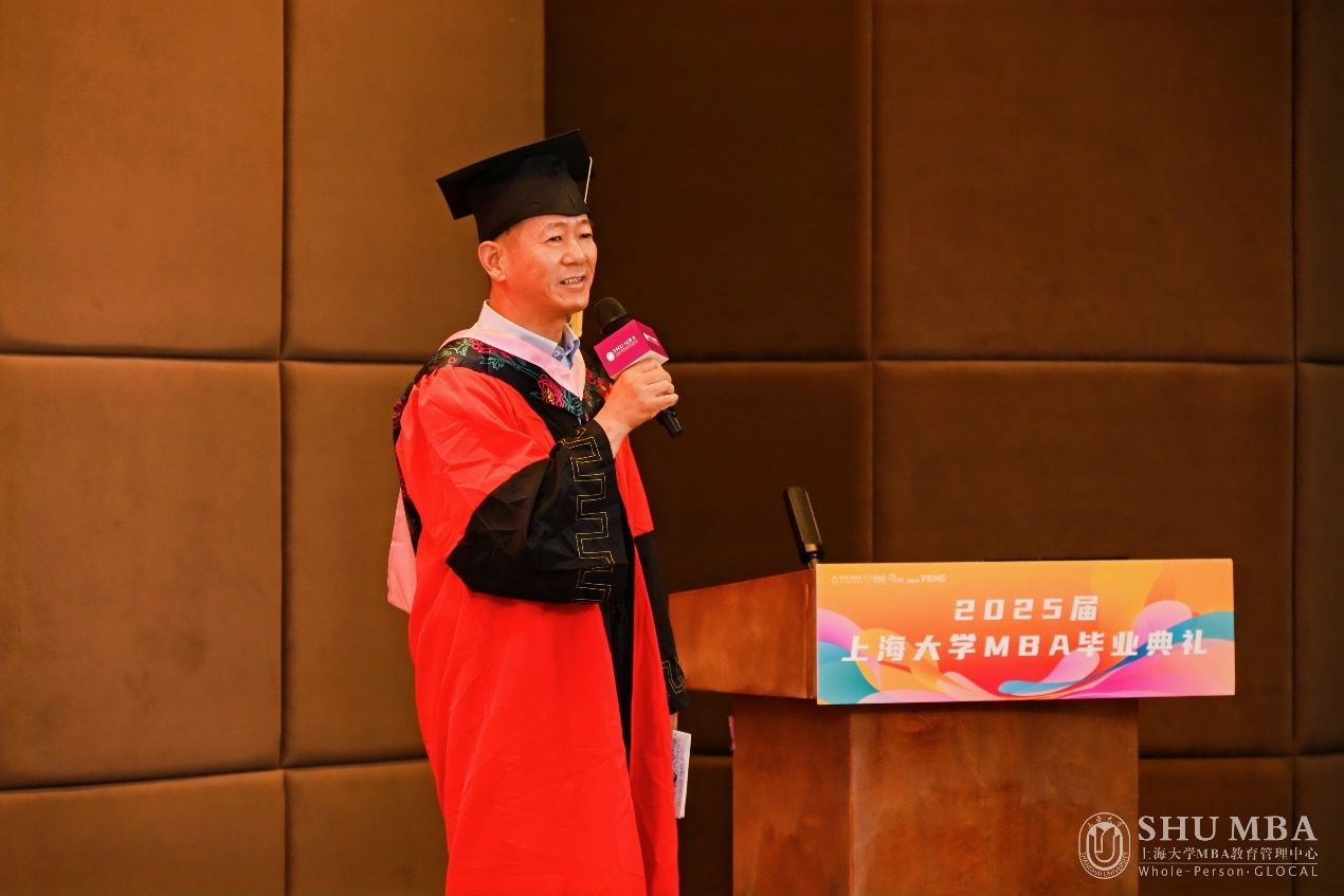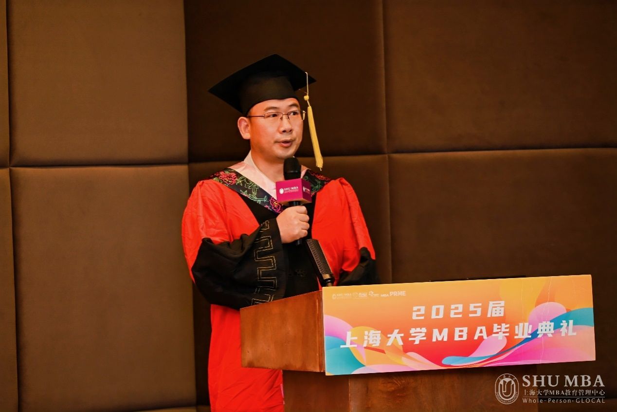 管理学院教授、信管系副主任、MBA中心信息系统管理与大数据课程教师戴德宝作为教师代表上台发言,他分享了MBA学习带来的知识体系完善和视野拓展的好处,以及对职场晋升和薪资的影响。他强调MBA中心不仅是学习之地,更是资源、人才与专家汇聚的宝库。他鼓励毕业生未来多与中心及老师联系合作。