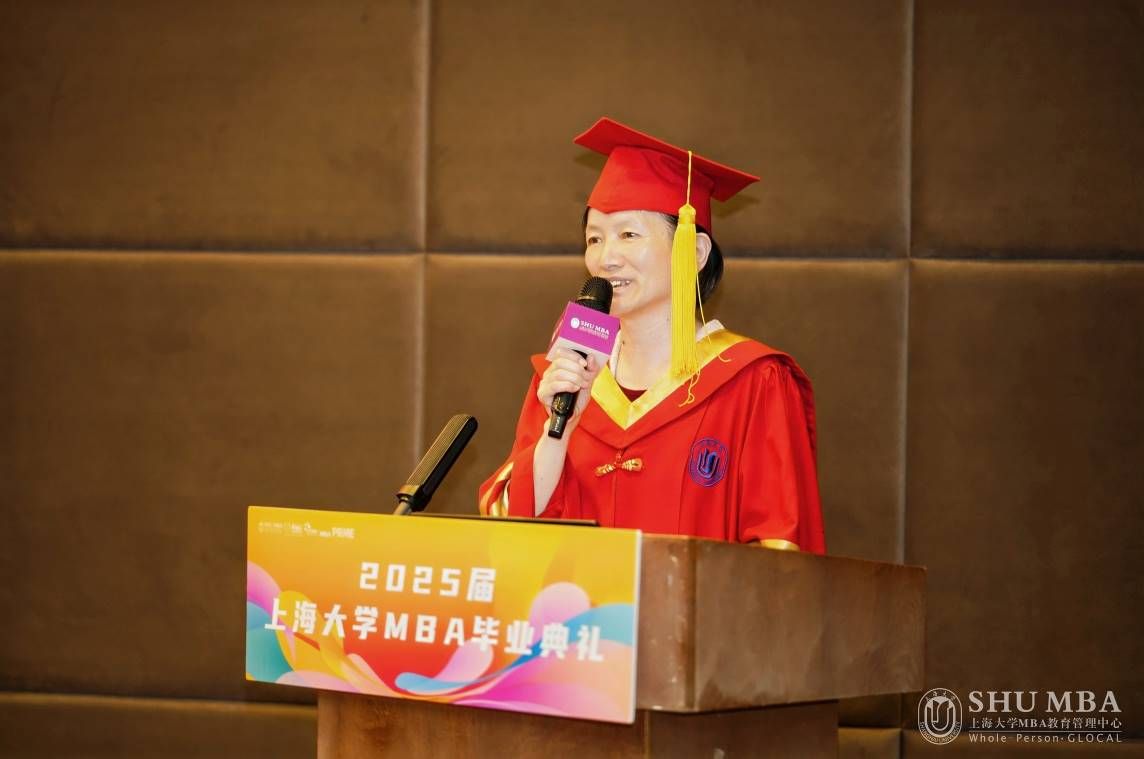 聂校长鼓励毕业生成为时代解码者、顺应时代的行动者和领军者。她强调MBA学生应具备全面发展的卓越创新人才特质及终身学习的重要性,并祝贺毕业生取得学位证书,鼓励他们继续深造和追求更高目标。